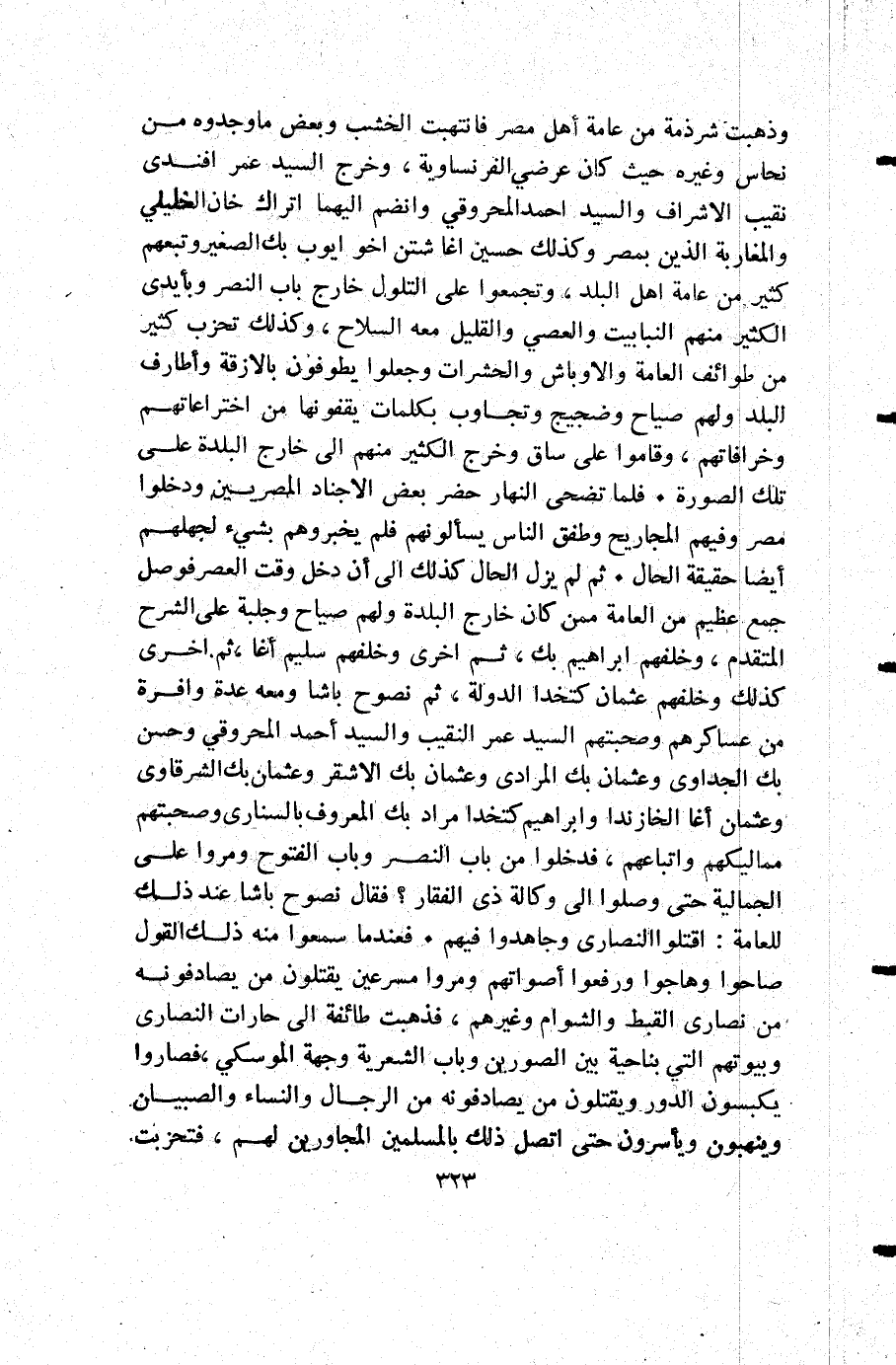وذهبت شرذمة من عامة أهل مصر فانتهبت الخشب وبعض ما وجدوه من نحاس وغيره حيث كان عرضي الفرنساويةوخرج السيد عمر أفندي نقيب الأشراف والسيد أحمد المحروقي وانضم إليهم اتراك خان الخليلي والمغاربة الذين بمصر وكذلك حسين أغا شتن أخو أيوب بك الصغير وتبعهم كثير من عامة أهل البلد وتجمعوا على التلول خارج باب النصر وبأيدي الكثير منهم النبابيت والعصي والقليل معه السلاح وكذلك تحزب كثير من طوائف العامة والأوباش والحشرات وجعلوا يطوفون بالازقة وأطارف البلد ولهم صياح وضجيج وتجاوب بكلمات يقفونها من اختراعاتهم وخرافاتهم وقاموا على ساق وخرج الكثير منهم إلى خارج البلدة على تلك الصورة فلما تضحى النهار حضر بعض الأجناد المصريين ودخلوا مصر وفيهم المجاريح وطفق الناس يسألونهم فلم يخبروهم بشيء لجهلهم أيضا حقيقة الحال ثم لم يزل الحال كذلك إلى أن دخل وقت العصر فوصل جمع عظيم من العامة ممن كان خارج البلدة ولهم صياح وجلبة على الشرح المتقدم وخلفهم إبراهيم بك ثم أخرى وخلفهم سليم أغا ثم أخرى كذلك وخلفهم عثمان كتخدا الدولة ثم نصوح باشا ومعه عدة وافرة من عساكرهم وصحبتهم السيد عمر النقيب والسيد أحمد المحروقي وحسن بك الجداوي وعثمان بك المرادي وعثمان بك الأشقر وعثمان بك الشرقاوي وعثمان أغا الخازندار وإبراهيم كتخدا مراد بك المعروف بالسنارى وصحبتهم مماليكهم واتباعهم فدخلوا من باب النصر وباب الفتوح ومروا على الجمالية حتى وصلوا إلى وكالة ذي الفقار فقال نصوح باشا عند ذلك للعامة: اقتلوا النصارى وجاهدوا فيهم فعندما سمعوا منه ذلك القول صاحوا وهاجوا ورفعوا أصواتهم ومروا مسرعين يقتلون من يصادفونه من نصارى القبط والشوام وغيرهم فذهبت طائفة إلى حارات النصارى وبيوتهم التي بناحية بين الصورين وباب الشعرية وجهة الموسكي فصاروا يكبسون الدور ويقتلون من يصادفونه من الرجال والنساء والصبيان وينهبون ويأسرون حتى اتصل ذلك بالمسلمين المجاورين لهم فتحزبت