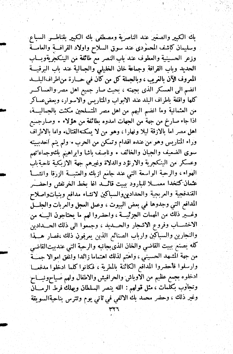 بك الكبير والصغير عند الناصرية ومصطفى بك الكبير بقناطر السباع وسليمان كاشف المحمودي عند سوق السلاح وأولاد القرافة والعامة وزعر الحسينية والعطوف عند باب النصر مع طائفة من الينكجرية وباب الحديد وباب القرافة وجماعة خان الخليلي والجمالية عند باب البرقية المعروف الآن بالغريب وبالجملة كل من كان في حارة من اطراف البلد انضم إلى العسكر الذي بجهته بحيث صار جميع أهل مصر والعساكر كلها واقفة باطراف البلد عند الأبواب والمتاريس والاسوار وبعض عساكر من العثمانية وما انضم إليهم من أهل مصر المتسلحين مكثت بالجمالية إذا جاء صارخ من جهة من الجهات بطائفة من هؤلاء وصار جميع أهل مصر أما بالازقة ليلا ونهارا وهو من لا يمكنه القتال وأما بالاطراف وراء المتاريس وهو من عنده اقدام وتمكن من الحرب ولم ينم أجد ببيته سوى الضعيف والجبان والخائف وناصف باشا وإبراهيم بك وجماعاتهم وعسكر من الينكجرية والارنؤد والدلاة وغيرهم جهة الأزبكية ناحية باب الهواء والرحبة الواسعة التي عند جامع ازبك والعتبة الزرقا وانشأ عثمان كتخدا معملا للبارود ببيت قائد اغا بخط الخرنفش وأحضر القندفجية والعربجية والحدادين والسباكين لانشاء مدافع وبنبات واصلاح المدافع التي وجدوها في بعض البيوت وعمل العجل والعربات والجلل وغير ذلك من المهمات الجزئيه وأحضروا لهم ما يحتاجون إليه من الاخشاب وفروع الأشجار والحديد وجمعوا إلى ذلك الحدادين والنجارين والسباكين وأرباب الصنائع الذين يعرفون ذلك فصار هذا كله يصنع ببيت القاضي والخان الذي بجانبه والرحبة التي عند بيت القاضي من جهة المشهد الحسيني واهتم لذلك اهتماما زائدا وانفق اموالا جمة وأرسلوا فأحضروا المدافع الكائنة بالمطرية فكانوا كلما ادخلوا مدفعا ادخلوه بجمع عظيم من الاوباش والحرافيش والأطفال ولهم صياح ونباح وتجاوب بكلمات مثل قولهم: الله ينصر السلطان ويهلك فرط الرمان وغير ذلك وحضر محمد بك الألفي في ثاني يوم وتترس بناحية السويقة