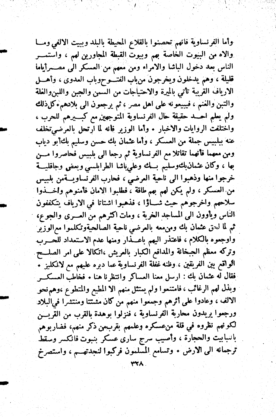 وأما الفرنساوية فإنهم تحصنوا بالقلاع المحيطة بالبلد وبيت الألفي وما والاه من البيوت الخاصة بهم وبيوت القبطة المجاورين لهم واستمر الناس بعد دخول الباشا والأمراء ومن معهم من العسكر إلى مصر أياما قليلة وهم يدخلون ويخرجون من باب الفتوح وباب العدوى وأهل الارياف القريبة تأتي بالميرة والاحتياجات من السمن والجبن واللبن والغلة والتبن والغنم فيبيعونه على أهل مصر ثم يرجعون إلى بلادهم كل ذلك ولم يعلم أجد حقيقة حال الفرنساوية المتوجهين مع كبيرهم للحرب واختلفت الروايات والأخبار وأما الوزير فإنه لما ارتحل بالعرضي تخلف عنه ببلبيس جملة من العسكر وأما عثمان بك حسن وسليم بك أبو دياب ومن معهما فإنهما تقاتلا مع الفرنساوية ثم رجعا إلى بلبيس فحاصروا من بها وكان عثمان بك وسليم بك وعلي باشا الطرابلسي وبعض وجاقلية خرجوا منها وذهبوا إلى ناحية العرضي فحارب الفرنساوية من بلبيس من العسكر ولم يكن لهم بهم طاقة فطلبوا الأمان فأمنوهم وأخذوا سلاحهم واخرجوهم حيث شاؤا فذهبوا اشتاتا في الارياف يتكففون الناس ويأوون إلى المساجد الخربة ومات اكثرهم من العرى والجوع ثم لما لحق عثمان بك ومن معه بالعرضي ناحية الصالحية وتكلموا مع الوزير واوجعوه بالكلام فاعتذر إليهم باعذار ومنها عدم الأستعداد للحرب وتركه معظم الجبخانة والمدافع الكبار بالعريش اتكالا على أمر الصلح الواقع بين الفريقين وظنه غفلة الفرنساوية عما دبره عليهم مع لانكليز فقال له عثمان بك أرسل معنا العساكر وانتظرنا هنا فخاطب العسكر وبذل لهم الرغائب فامتنعوا ولم يمتثل منهم إلا المطيع والمتطوع وهم نحو الألف وعادوا على أثرهم وجمعوا منهم من كان مشتتا ومنتشرا في البلاد ورجعوا يريدون محاربة الفرنساوية فنزلوا بوهدة بالقرب من القرين لكونهم نظروه في قلة من عسكره وعلمهم بقرب من ذكر منهم فضاربوهم بالنبابيت والحجارة وأصيب سرج سارى عسكر بنبوت فانكسر وسقط ترجمانة إلى الأرض وتسامع المسلمون فركبوا لنجدتهم واستصرخ
