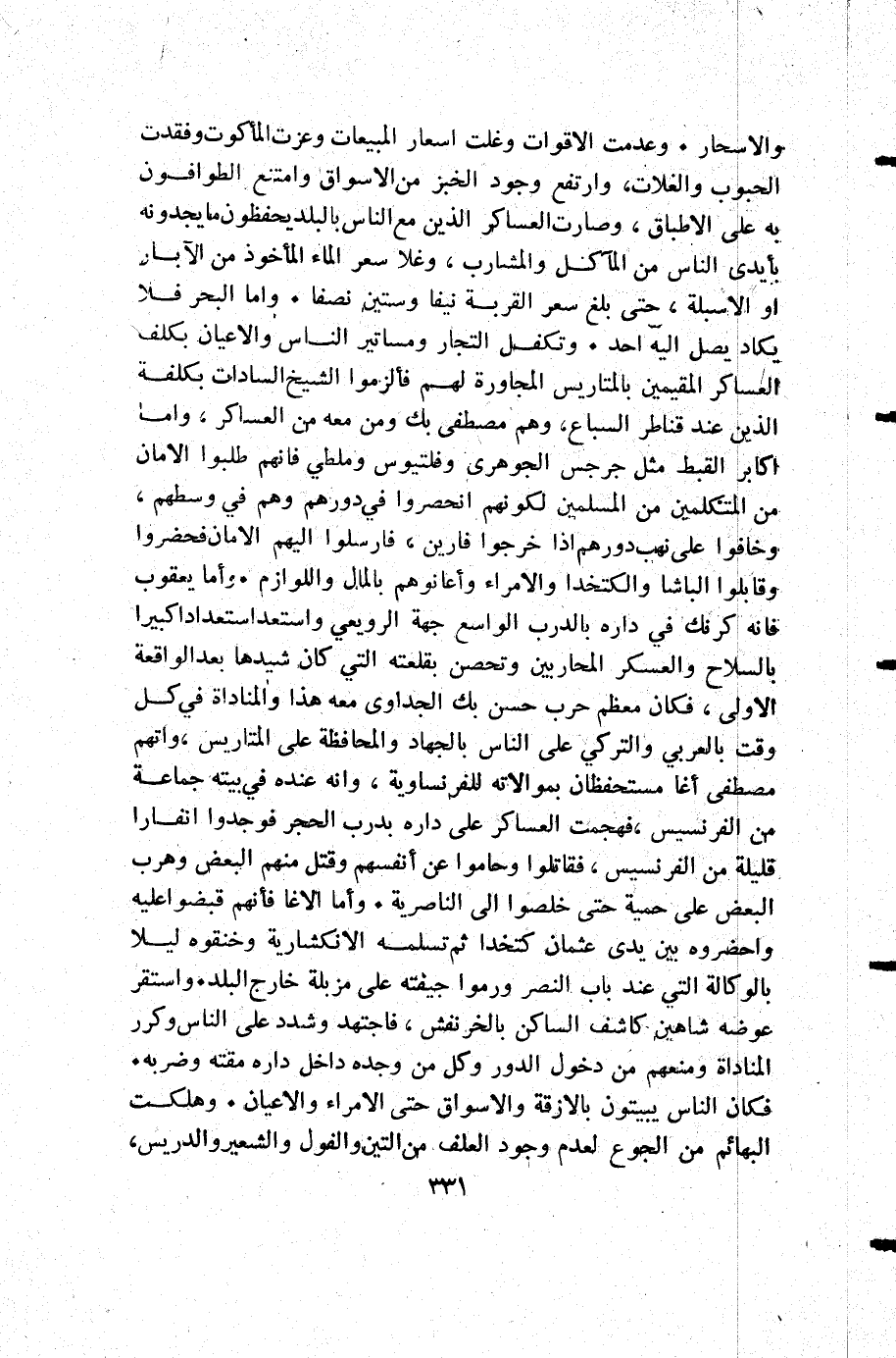 والاسحار وعدمت الاقوات وغلت اسعار المبيعات وعزت المأكوت وفقدت الحبوب والغلات وارتفع وجود الخبز من الأسواق وامتنع الطوافون به على الاطباق وصارت العساكر الذين مع الناس بالبلد يحفظون ما يجدونه بأيدي الناس من المأكل والمشارب وغلا سعر الماء المأخوذ من الأبار أو الأسبلة حتى بلغ سعر القربة نيفا وستين نصفا وأما البحر فلا يكاد يصل إليه أجد وتكفل التجار ومساتير الناس والأعيان بكلف العساكر المقيمين بالمتاريس المجاورة لهم فألزموا الشيخ السادات بكلفة الذين عند قناطر السباع وهم مصطفى بك ومن معه من العساكر وأما أكابر القبط مثل جرجس الجوهري وفلتيوس وملطي فإنهم طلبوا الأمان من المتكلمين من المسلمين لكونهم انحصروا في دورهم وهم في وسطهم وخافوا على نهب دورهم إذا خرجوا فارين فأرسلوا إليهم الأمان فحضروا وقابلوا الباشا والكتخدا والأمراء وأعانوهم بالمال واللوازم وأما يعقوب فإنه كرنك في داره بالدرب الواسع جهة الرويعي واستعد استعدادا كبيرا بالسلاح والعسكر المحاربين وتحصن بقلعته التي كان شيدها بعد الواقعة الأولى فكان معظم حرب حسن بك الجداوي معه هذا والمناداة في كل وقت بالعربي والتركي على الناس بالجهاد والمحافظة على المتاريس وأنهم مصطفى أغا مستحفظان بموالاته للفرنساوية وأنه عنده في بيته جماعة من الفرنسيس فهجمت العساكر على داره بدرب الحجر فوجدوا انفارا قليلة من الفرنسيس فقاتلوا وحاموا عن أنفسهم وقتل منهم البعض وهرب البعض على حمية حتى خلصوا إلى الناصرية وأما الاغا فإنهم قبضوا عليه وأحضروه بين يدي عثمان كتخدا ثم تسلمه الانكشارية وخنقوه ليلا بالوكالة التي عند باب النصر ورموا جيفته على مزبلة خارج البلد واستقر عوضه شاهين كاشف الساكن بالخرنفش فاجتهد وشدد على الناس وكرر المناداة ومنعهم من دخول الدور وكل من وجده داخل داره مقته وضربه فكان الناس يبيتون بالازقة والأسواق حتى الأمراء والأعيان وهلكت البهائم من الجوع لعدم وجود العلف من التين والفول والشعير والدريس