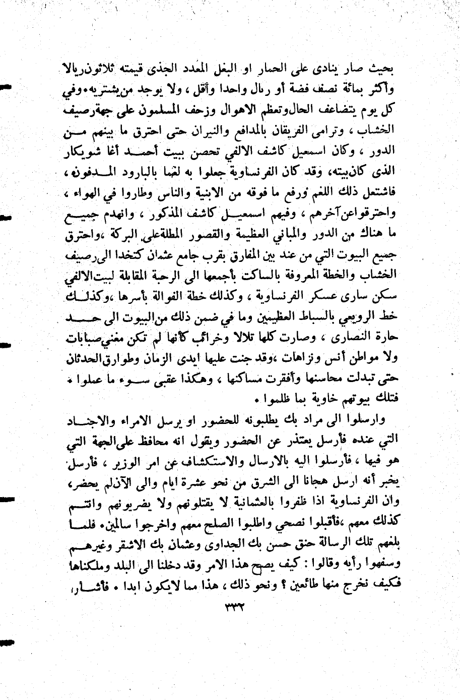 بحيث صار ينادي على الحمار أو البغل المعدد الجذى قيمته ثلاثون ريالا وأكثر بمائة نصف فضة أو ريال واحدا وأقل ولا يوجد من يشتريه وفي كل يوم يتضاعف الحال وتعظم الاهوال وزحف المسلمون على جهة رصيف الخشاب وترامى الفريقان بالمدافع والنيران حتى احترق ما بينهم من الدور وكان إسمعيل كاشف الألفي تحصن ببيت أحمد أغا شويكار الذي كان بيته وقد كان الفرنساوية جعلوا به لعما بالبارود المدفون فاشتعل ذلك اللغم ورفع ما فوقه من الأبنية والناس وطاروا في الهواء واحترقوا عن آخرهم وفيهم إسمعيل كاشف المذكور وأنهدم جميع ما هناك من الدور والمباني العظيمة والقصور المطلة على البركة واحترق جميع البيوت التي من عند بين المفارق بقرب جامع عثمان كتخدا إلى رصيف الخشاب والخطة المعروفة بالساكت بأجمعها إلى الرحبة المقابلة لبيت الألفي سكن سارى عسكر الفرنساوية وكذلك خطة الفوالة بأسرها وكذلك خط الروبعي بالسباط العظيمين وما في ضمن ذلك من البيوت إلى حد حارة النصارى وصارت كلها تلالا وخرائب كأنها لم تكن مغني صبابات ولا مواطن أنس ونزاهات وقد جنت عليها أيدي الزمان وطوارق الحدثان حتى تبدلت محاسنها وأفقرت مساكنها وهكذا عقبى سوء ما عملوا فتلك بيوتهم خاوية بما ظلموا.