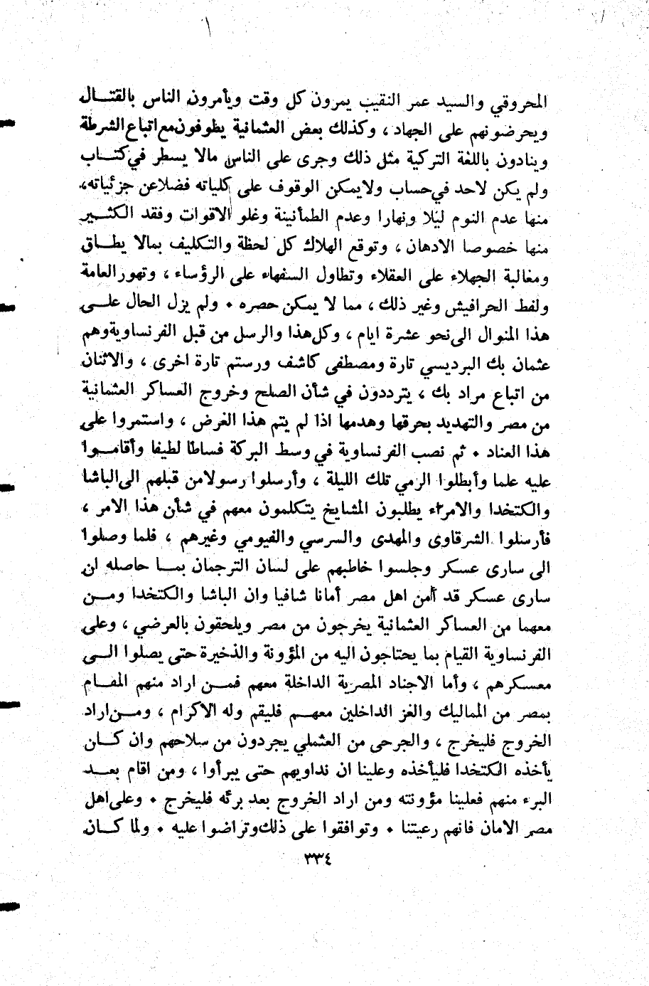 المحروقي والسيد عمر النقيب يمرون كل وقت ويأمرون الناس بالقتال ويحرضونهم على الجهاد وكذلك بعض العثمانية يطوفون مع اتباع الشرطة وينادون باللغة التركية مثل ذلك وجرىعلى الناس ما لا يسطر في كتاب ولم يكن لاحد في حساب ولا يمكن الوقوف على كلياته فضلا عن جزئياته منها عدم النوم ليلا ونهارا وعدم الطمأنينة وغلو الاقوات وفقد الكثير منها خصوصا الأدهان وتوقع الهلاك كل لحظة والتكليف بما لا يطاق ومغالبة الجهلاء على العقلاء وتطاول السفهاء على الرؤساء وتهور العامة ولفط الحرافيش وغير ذلك مما لا يمكن حصره ولم يزل الحال على هذا المنوال إلى نحو عشرة أيام وكل هذا والرسل من قبل الفرنساوية وهم عثمان بك البرديسي تارة ومصطفى كاشف ورستم تارة أخرى والاثنان من اتباع مراد بك يترددون في شأن الصلح وخروج العساكر العثمانية من مصر والتهديد بحرقها وهدمها إذا لم يتم هذا الغرض واستمروا على هذا العناد ثم نصب الفرنساوية في وسط البركة فساطا لطيفا وأقاموا عليه علما وأبطلوا الرمي تلك الليلة وأرسلوا رسولا من قبلهم إلى الباشا والكتخدا والأمراء يطلبون المشايخ يتكلمون معهم في شأن هذا الأمر فأرسلوا الشرقاوي والمهدي والسرسي والفيومي وغيرهم فلما وصلوا إلى سارى عسكر وجلسوا خاطبهم على لسان الترجمان بما حاصله أن سارى عسكر قد أمن أهل مصر أمانا شافيا وأن الباشا والكتخدا ومن معهما من العساكر العثمانية يخرجون من مصر ويلحقون بالعرضي وعلى الفرنساوية القيام بما يحتاجون إليه من المؤونة والذخيرة حتى يصلوا إلى معسكرهم وأما الأجناد المصرية الداخلة معهم فمن أراد منهم المقام بمصر من المماليك والغز الداخلين معهم فليقم وله الأكرام ومن أراد الخروج فليخرج والجرحى من العثملي يجردون من سلاحهم وأن كان يأخذه الكتخدا فليأخذه وعلينا أن نداويهم حتى يبرأوا ومن أقام بعد البرء منهم فعلينا مؤونته ومن أراد الخروج بعد برئه فليخرج وعلى أهل مصر الأمان فإنهم رعيتنا وتوافقوا على ذلك وتراضوا عليه ولما كان
