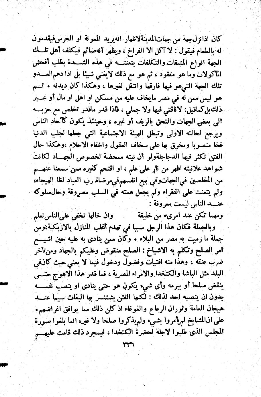 كان إذا نزل جهة من جهات المدينة لاظهار أنه يريد المعونة أو الحرس فيقدمون له بالطعام فيقول: لا آكل إلا الفراخ ويظهر أنه صائم فيكلف أهل تلك الجهة أنواع المشتقات والتكلفات بتعنته في هذه الشدة بطلب أفحش المأكولات وما هو مفقود ثم هو مع ذلك لا يغني شيئا بل إذا دهم العدو تلك الجهة التي هو فيها فارقها وانتقل لغيرها وهكذا كان ديدنه ثم هو ليس ممن له في مصر ما يخاف عليه من مسكن أو أهل أو مال أو غير ذلك بل كما قيل: لا ناقتي فيها ولا جملي فإذا قدر ما قدر تخلص مع حزبه إلى بعض الجهات والتحق بالريف أو غيره وحينئذ يكون كآحاد الناس ويرجع لحالته الأولى وتبطل الهيئة الاجتماعية التي جعلها لجلب الدنيا فخا منصوبا ومخرق بها على سخاف العقول وإخفاء الاحلام وهكذا حال الفتن تكثر فيها الدجاجلة ولو أن نيته ممحضة لخصوص الجهاد لكانت شواهد علانيته اظهر من نار على علم أو اقتحم كغيره ممن سمعنا عنهم من المخلصين في الجهات وفي بيع أنفسهم في مرضاة رب العباد لظا الهيجاء ولم يتعنت على الفقراء ولم يجعل همته في السلب مصروفة وحال سلوكه عند الناس ليست معروفة.