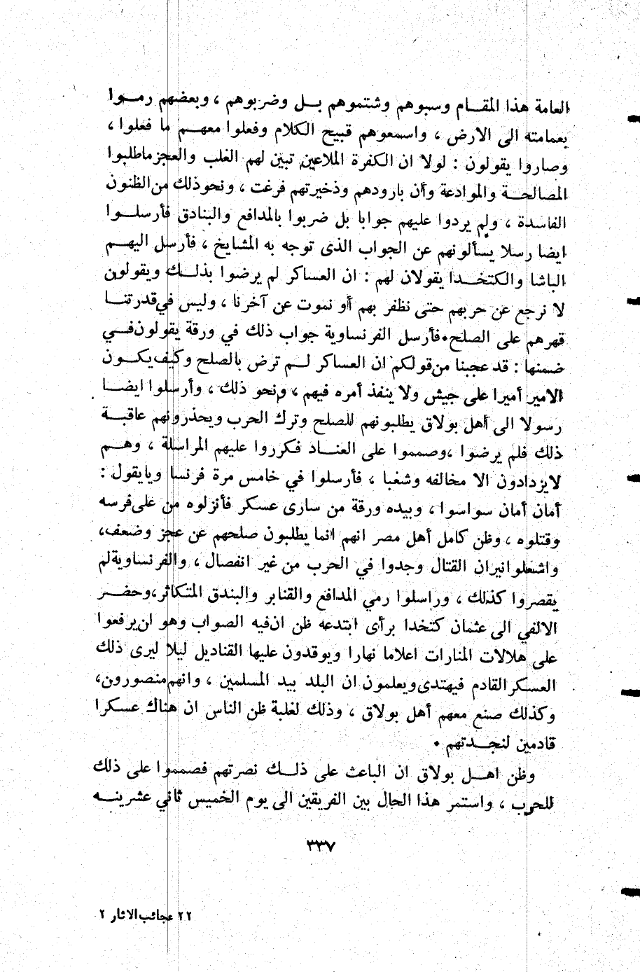 العامة هذا المقام وسبوهم وشتموهم بل وضربوهم وبعضهم رموا بعمامته إلى الأرض واسمعوهم قبيح الكلام وفعلوا معهم ما فعلوا وصاروا يقولون لولا أن الكفرة الملاعين تبين لهم الغلب والعجز ما طلبوا المصالحة والموادعة وأن بارودهم وذخيرتهم فرغت ونحو ذلك من الظنون الفاسدة ولم يردوا عليهم جوابا بل ضربوا بالمدافع والبنادق فأرسلوا أيضا رسلا يسالونهم عن الجواب الذي توجه به المشايخ فأرسل إليهم الباشا والكتخدا يقولان لهم أن العساكر لم يرضوا بذلك ويقولون لا نرجع عن حربهم حتى نظفر بهم أو نموت عن خرنا وليس في قدرتنا قهرهم على الصلح فأرسل الفرنساوية جواب ذلك في ورق يقولون في ضمنها: قد عجبنا من قولكم إن العساكر لم ترض بالصلح وكيف يكون الأمير أميرا على جيش ولا ينفذ أمره فيهم ونحو لك وأرسلوا أيضا رسولا إلى أهل بولاق يطلبونهم للصلح وترك الحرب ويحذرونهم عاقبة ذلك فلم يرضوا وصمموا على العناد فكرروا عليهم المراسلة وهم لا يزدادون إلا مخالفة وشغبا فأرسلوا في خامس مرة فرنساويا يقول أمان أمان سواسوا وبيده ورق من سارى عسكر فأنزلوه من على فرسه وقتلوه وظن كامل أهل مصر أنهم إنما يطلبون صلحهم عن عجز وضعف واشعلوا نيران القتال وجدوا في الحرب من غير انفصال والفرنساوية لم يقصروا كذلك وراسلوا رمي المدافع والقنابر والبندق المتكاثر وحضر الألفي إلى عثمان كتخدا برأي ابتدعه ظن أن فيه الصواب وهو أن يرفعوا على هلالات المنارات أعلاما نهارا ويوقدون عليها القناديل ليلا ليرى ذلك العسكر القادم فيهتدي ويعلمون أن البلد بيد المسلمين وأنهم منصورون وكذلك صنع معهم أهل بولاق وذلك لغلبة ظن الناس أن هناك عسكرا قادمين لنجدتهم.