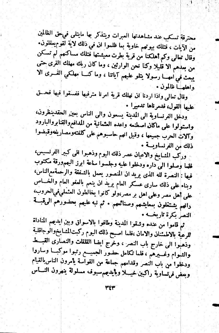 وركب المشايخ والأعيان عصر ذلك اليوم وذهبوا إلى كبير الفرنسيس فلما وصلوا إلى داره ودخلوا عليه وجلسوا ساعة ابرز إليهم ورقة مكتوب فيها النصرة لله الذي يريد أن المنصور يعمل بالشفقة والرحمة مع الناس وبناء على ذلك سارى عسكر العام يريد أن ينعم بالعفو العام والخاص على أهل مصر وعلى أهل بر مصر ولو كانوا يخالطون العثملي في الحروب وأنهم يشتغلون بمعايشهم وصنائعهم ثم نبه عليه بحضورهم إلى قبة النصر بكرة تاريخه.