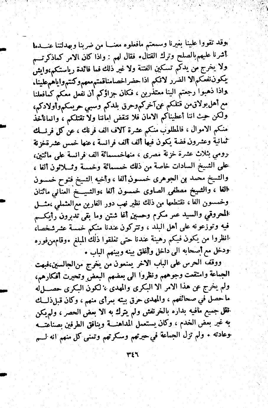 وقد تقووا علينا بغيرنا وسمعتم ما فعلوه معنا من ضربنا وبهدلتنا عندما أشرنا عليهم بالصلح وترك القتال فقال لهم وإذا كان الأمر كما ذكرتم ولا يخرج من يدكم تسكين الفتنة ولا غير ذلك فما فائدة رياستكم وايش يكون نفعكم إلا الضرر لأنكم إذا حضر اخصامنا قمتم معهم وكنتم وإياهم علينا وإذا ذهبوا رجعتم إلينا معتذرين فكان جزاؤكم أن نفعل معكم كما فعلنا مع أهل بولاق من قتلكم عن آخركم وحرق بلدكم وسبي حريمكم وأولادكم ولكن حيث أننا أعطيناكم الأمان فلا تنقض اماننا ولا نقتلكم وإنما نأخذ منكم الأموال فالمطلوب منكم عشرة آلاف ألف فرنك عن كل فرنك ثماينة وعشرون فضة يكون فيها ألف ألف فرانسة عنها خمس عشرة خزنة رومي بثلاث عشرة خزنة مصري منها خمسمائة ألف فرانسة على مائتين على الشيخ السادات خاصة من ذلك خمسمائة وخمسة وثلاثون الفا والشيخ محمد بن الجوهري خمسون ألفا وأخيه الشيخ فتوح خمسون الفا والشيخ مصطفى الصاوي خمسون ألفا والشيخ العناني مائتان وخمسون الفا تقتطعها من ذلك نظير نهب دور الفارين مع العثملي مثل المحروقي والسيد عمر مكرم وحسين أغا شتن وما بقى تدبرون رايكم فيه وتوزعونه على أهل البلد وتتركون عندنا منكم خمسة عشر شخصا انظروا من يكون فيكم رهينة عندنا حتى تغلقوا ذلك المبلغ وقام من فوره ودخل مع اصحابه إلى داخل وأغلق بينه وبينهم الباب.