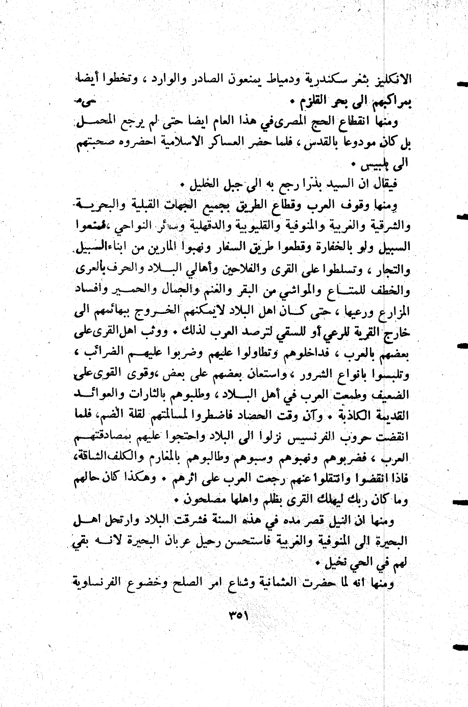 ومنها: وقوف العرب وقطاع الطريق بجميع الجهات القبلية والبحرية والشرقية والغربية والمنوفية والقليوبية والدقهلية وسائر النواحي فمنعوا السبيل ولو بالخفارة وقطعوا طريق السفار ونهبوا المارين من ابناء السبيل والتجار وتسلطوا على القرى والفلاحين وأهالي البلاد والحرف بالعري والخطف للمتاع والمواشي من البقر والغنم والجمال والحمير وافساد المزارع ورعيها حتى كان أهل البلاد لا يمكنهم الخروج ببهائمهم إلى خارج القرية للرعي أو للسقي لترصد العرب لذلك ووثب أهل القرى على بعضهم بالعرب فداخلوهم وتطاولوا عليهم وضربوا عليهم الضرائب وتلبسوا بأنواع الشرور واستعان بعضهم على بعض وقوى القوى على الضعيف وطمعت العرب في أهل البلاد وطلبوهم بالثارات والعوائد القديمة الكاذبة وأن وقت الحصاد فاضطروا لمسالمتهم لقلة الضم فلما انقضت حروب الفرنسيس نزلوا إلى البلاد واحتجوا عليهم بمصادقتهم العرب فضربوهم ونهبوهم وسبوهم وطالبوهم بالمغارم والكلف الشاقة فإذا انقضوا وانتقلوا عنهم رجعت العرب على اثرهم وهكذا كان حالهم وما أن ربك ليهلك القرى بظلم واهلها مصلحون.