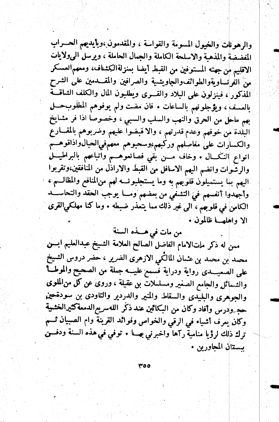 ممن له ذكر مات الإمام الفاضل الصالح العلامة الشيخ عبد العليم ابن محمد بن محمد بن عثمان المالكي الأزهري الضرير حضر دروس الشيخ علي الصعيدي رواية ودراية فسمع عليه جملة من الصحيح والموطأ والشمائل والجامع الصغير ومسلسلات بن عقيلة وروى عن كل من الملوى والجوهري والبلدي والسقاط والمنير والدردير والتاودي بن سودة حين حج ودرس وأفاد وكل من البكائين عند ذكر الله سريع الدمعة كثير الخشية وكان يعرف أشياء في الرقي والخواص وفوائد القرينة وام الصبيان ثم ترك ذلك لرؤيا منامية رآها واخبرني بها توفي في هذه السنة ودفن ببستان المجاورين
