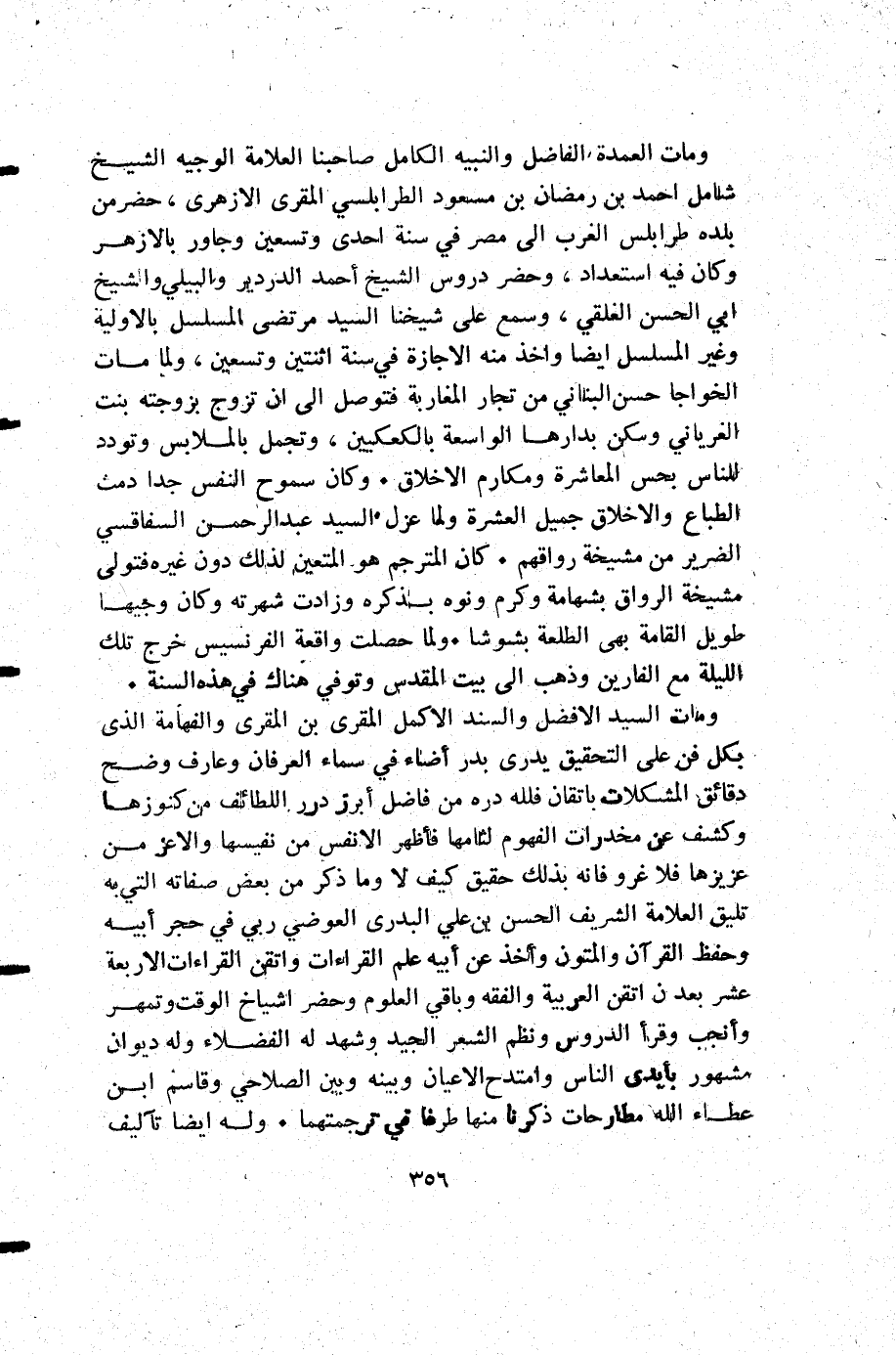 ومات العمدة الفاضل والنبيه الكامل صاحبنا العلامة الوجيه الشيخ شامل أحمد بن رمضان بن مسعود الطرابلسي المقرى الأزهري حضر من بلده طرابلس الغرب إلى مصر في سنة احدى وتسعين وجاور بالأزهر وكان فيه استعداد وحضر دروس الشيخ أحمد الدردير والبيلي والشيخ أبي الحسن الغلقي وسمع على شيخنا السيد مرتضى المسلسل بالاولية وغير المسلسل أيضا وأخذ منه الإجازة في سنة اثنتين وتسعين ولما مات الخواجا حسن البناني من تجار المغاربة فتوصل إلى أن تزوج بزوجته بنت الغرياني وسكن بدارها الواسعة بالكعكبين وتجمل بالملابس وتودد للناس بحسن المعاشرة ومكارم الاخلاق وكان سموح النفس جدا دمت الطباع والأخلاق جميل العشرة ولما عزل السيد عبد الرحمن السفاقسي الضرير من مشيخة رواقهم كان المترجم هو المتعين لذلك دون غيره فتولى مشيخة الرواق بشهامة وكرم ونوه بذكره وزادت شهرته وكان وجيها طويل القامة بهى الطلعة بشوشا ولما حصلت واقعة الفرنسيس خرج تلك الليلة مع الفارين وذهب إلى بيت المقدس وتوفي هناك في هذه السنة.