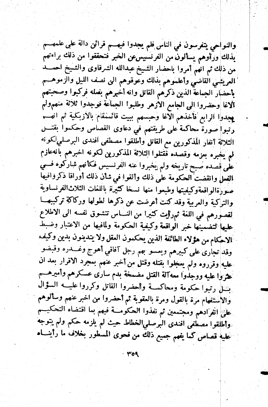 والنواحي يتفرسون في الناس فلم يجدوا فيهم قرائن دالة على علمهم بذلك ورأوهم يسألون من الفرنسيس عن الخبر فتحققوا من ذلك برائتهم من ذلك ثم أنهم أمروا باحضار الشيخ عبد الله الشرقاوي والشيخ أحمد العريشي القاضي وأعلموهم بذلك وعوقوهم إلى نصف الليل والزموهم بأحضار الجماعة الذين ذكرهم القاتل وأنه أخبرهم بفعله فركبوا وصحبتهم الاغا وحضروا إلى الجامع الأزهر وطلبوا الجماعة فوجدوا ثلاثة منهم ولم يجدوا الرابع فأخذهم الاغا وحبسهم ببيت قائممقام بالازبكية ثم أنهم رتبوا صورة محاكمة على طريقتهم في دعاوى القصاص وحكموا بقتل الثلاثة أنفار المذكورين مع القاتل وأطلقوا مصطفى أفندي البوصلي لكونه لم يخبره بعزمه وقصده فقتلوا الثلاثة المذكورين لكونه أخبرهم بأنه عازم على قصده صبح تاريخه ولم يخبروا عنه الفرنسيس فكأنهم شاركوه في الفعل وانقضت الحكومة على ذلك وألقوا في شأن ذلك أرواقا ذكروا فيها صورة الواقعة وكيفيتها وطبعوا منها نسخا كثيرة باللغات الثلاث الفرنساوية والتركية والعربية وقد كنت أعرضت عن ذكرها لطولها وركاكة تركيبها لقصورهم في اللغة ثم رايت كثيرا من الناس تتشوق نفسه إلى الاطلاع عليها لتضمينها خبر الواقعة وكيفية الحكومة ولما فيها من الأعتبار وضبط الأحكام من هؤلاء الطائفة الذين يحكمون العقل ولا يتدينون بدين وكيف وقد تجارى على كبيرهم ويعسو بهم رجل آفاقي أهوج وغدره وقبضوا عليه وقرروه ولم يعجلوا بقتله وقتل من أخبر عنهم بمجرد الاقرار بعد أن عثروا عليه ووجدوا معه آلة القتل مضمخة بدم سارى عسكرهم وأميرهم بل رتبوا حكومة ومحاكمة وأحضروا القاتل وكرروا عليه السؤال والاستفهام مرة بالقول ومرة بالعقوبة ثم أحضروا من أخبر عنهم وسألوهم على انفرادهم ومجمعين ثم نفذوا الحكومة فيهم بما اقتضاه التحكيم وأطلقوا مصطفى أفندي البوصلي الخطاط حيث لم يلزمه حكم ولم يتوجه عليه قصاص كما يفهم جميع ذلك من فحوى المسطور بخلاف ما رأيناه