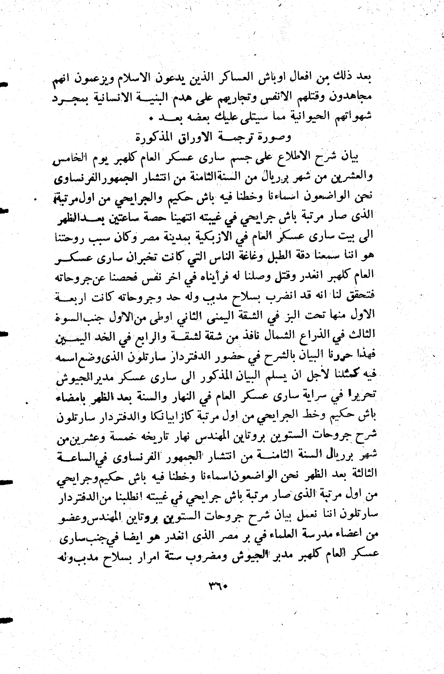 بيان شرح الاطلاع على جسم سارى عسكر العام كلهبر يوم الخامس والعشرين من شهر برريال من السنة الثامنة من انتشار الجمهور الفرنساوي نحن الواضعون أسماءنا وخطنا فيه باش حكيم والجرايحي من أول مرتبة الذي صار مرتبة باش جرايحي في غيبته انتهينا حصة ساعتين بعد الظهر إلى بيت سارى عسكر العام في الأزبكية بمدينة مصر وكان سبب روحتنا هو اننا سمعنا دقة الطبل وغاغة الناس التي كانت تخبران سارى عسكر العام كلهبر انغدر وقتل وصلنا له فرأيناه في آخر نفس فحصنا عن جروحاته فتحقق لنا أنه قد انضرب بسلاح مدبب وله حد وجروحاته كانت أربعة الأول منها تحت البز في الشقة اليمنى الثاني اوطى من الأول جنب السوة الثالث في الذراع الشمال نافذ من شقة لشقة والرابع في الخد اليمين فهذا حررنا البيان بالشرح في حضور الدفنزادر سارتلون الذي وضع اسمه فيه كمثلنا لأجل أن يسلم البيان المذكور إلى سارى عسكر مدير الجيوش تحريرا في سراية سارى عسكر العام في النهار والسنة بعد الظهر بامضاء باش حكيم وخط الجرايحي من أول مرتبة كازابيانكا والدفتردار سارتلون شرح جروحات الستوين بروتاين المهندس نهار تاريخه خمسة وعشرين من شهر برريال السنة الثامنة من انتشار الجمهور الفرنساوي في الساعة الثالثة بعد الظهر نحن الواضعون اسماءنا وخطنا فيه باش حكيم وجرايحي من أول مرتبة الذي صار مرتبة باش جرايحي في غيبته انطلبنا من الدفتردار سارتلون أننا نعمل بيان شرح جروحات الستوين بروتاين المهندس وعضو من اعضاء مدرسة العلماء في بر مصر الذي انغدر هو أيضا في جنب سارى عسكر العام كلهبر مدبر الجيوش ومضروب ستة امرار بسلاح مدبب وله