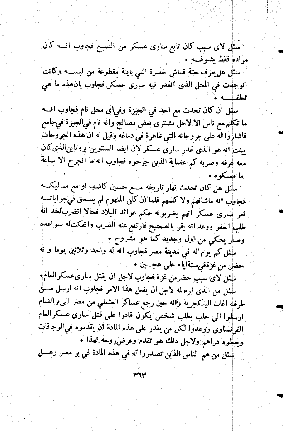 سئل أن كان تحدث مع أجد في الجيزة وفي أي محل نام فجاوب أنه ما تكلم مع ناس إلا لأجل مشترى بعض مصالح وأنه نام في الجيزة في جامع فاشاروا له على جروحاته التي ظاهرة في دماغه وقيل له أن هذه الجروحات بينت أنه هو الذي غدر سارى عسكر لأن أيضا الستوين بروتاين الذي كان معه عرفه وضربه كم عصاية الذين جرحوه فجاوب أنه ما انجرح إلا ساعة ما مسكوه.