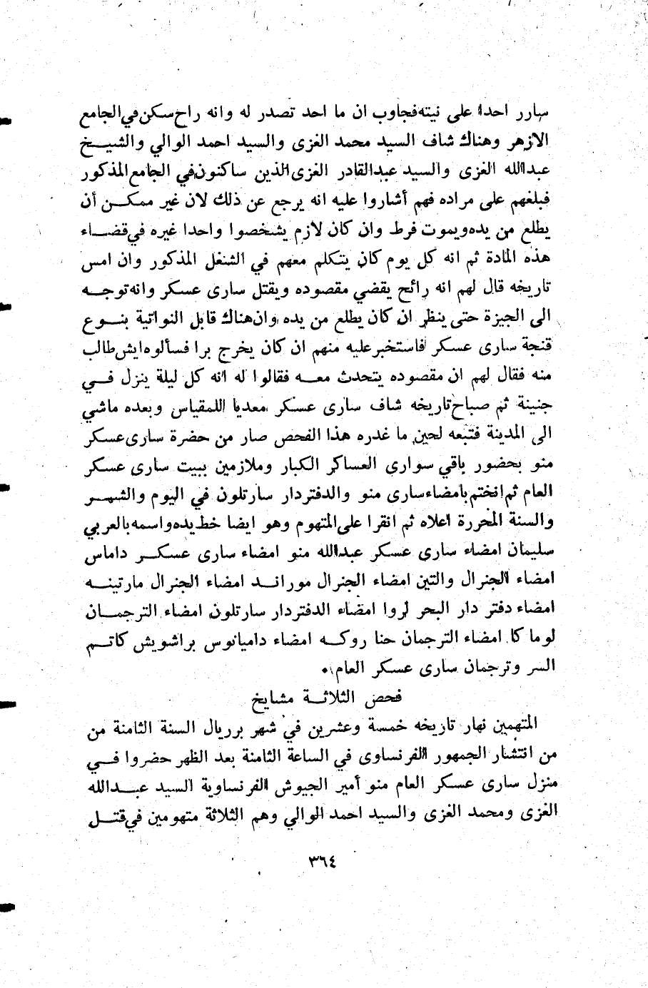 سارر أحدا على نيته فجاوب أن ما أجد تصدر له وأنه راح سكن في الجامع الأزهر وهناك شاف السيد محمد الغزي والسيد أحمد الوالي والشيخ عبد الله الغزي والسيد عبد القادر الغزي الذين ساكنون في الجامع المذكور فبلغهم على مراده فهم أشاروا عليه أنه يرجع عن ذلك لأن غير ممكن أن يطلع من يده ويموت فرط وأن كان لازم يشخصوا واحدا غيره في قضاء هذه المادة ثم إنه كل يوم كان يتكلم معهم في الشغل المذكور وأن امس تاريخه قال لهم أنه رائح يقضي مقصوده ويقتل سارى عسكر وأنه توجه إلى الجيزة حتى ينظر أن كان يطلع من يده وأن هناك قابل النواتية بنوع قنجة سارى عسكر فاستخبر عليه منهم أن كان يخرج برا فسالوه ايش طالب منه فقال لهم أن مقصوده يتحدث معه فقالوا له أنه كل ليلة ينزل في جنينة ثم صباح تاريخه شاف سارى عسكر معديا للمقياس وبعده ماشي إلى المدينة فتبعه لحين ما غدره هذا الفحص صار من حضرة سارى عسكر منو بحضور باقي سوارى العساكر الكبار وملازمين ببيت سارى عسكر العام ثم انختم بامضاء سارى منو والدفتردار سارتلون في اليوم والشهر والسنة المحررة أعلاه ثم انقرا على المتهوم وهو أيضا خط يده واسمه بالعربي سليمان امضاء سارى عسكر عبد الله منو امضاء سارى عسكر داماس امضاء الجنرال والتين امضاء الجنرال موراند امضاء الجنرال مارتينه امضاء دفتر دار البحر لروا امضاء الدفتردار سارتلون امضاء الترجمان لو ما كان امضاء الترجمان حنا روكه امضاء داميانوس براشويش كاتم السر وترجمان سارى عسكر العام.