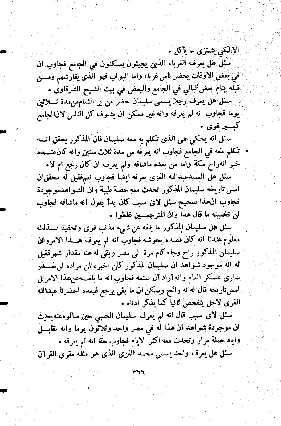 سئل هل السيد عبد الله العزي يعرفه أيضا فجاوب نعم فقيل له محقق أن أمس تاريخه سليمان المذكور تحدث معه حصة طيبة وأن الشواهد موجودة فجاوب أن هذا صحيح سئل لأي سبب كان بدأ يقول: إنه ما شافه فجاوب أن تخمينه ما قال هذا وأن المترجمين غلطوا.