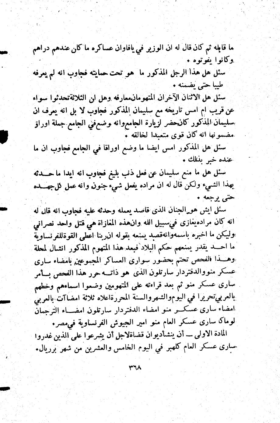 سئل ايش هو الجنان الذي قاصد يعمله وحدثه عليه فجاوب أنه قال له: إنه كان مراده يغازي في سبيل الله وأن هذه المغازاة هي قتل واحد نصراني وليكن ما أخبره باسمه وأنه قصد يمنعه بقوله أن ربنا اعطى القوة للفرنساوية ما أجد يقدر يمنعهم حكم البلاد فبعد هذا المتهوم المذكور انشال لمحله وهذا الفحص تحتم بحضور سوارى العساكر المجموعين بامضاء سارى عسكر منو والدفتردار سارتلون الذي هو ذاته حرر هذا الفحص بأمر سارى عسكر منو ثم بعد قراءته على المتهومين وضعوا اسماءهم وخطهم بالعربي تحريرا في اليوم والشهر والسنة المحرر أعلاه ثلاث امضاآت بالعربي امضاء سارى عسكر منو إمضاء الدفتردار سارتلون امضاء الترجمان لو ما كا سارى عسكر العام منو أمير الجيوش الفرنساوية في مصر.