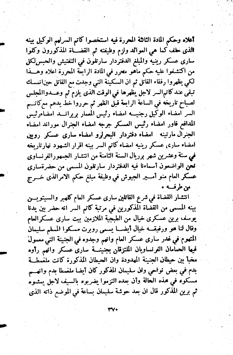 أعلاه وحكم المادة الثالثة المحررة فيه استخصوا كاتم السرلهم الوكيل بينه الذي حلف كما هي العوائد ولزم وظيفته ثم القضاة المذكورون وكلوا سارى عسكر رينيه والمبلغ الدفتردار سارتلون في التفتيش والحبس لكل من اكتشفوا عليه حكم ما هو محرر في المادة الرابعة المحررة أعلاه وهذا لكي يظهروا رفقاء القاتل ثم أن السكينة التي وجدت مع القاتل حين انمسك تبقى عند كاتم السر لأجل يظهرها في الوقت الذي يلزم ثم وعدوا المجلس لصباح تاريخه في الساعة الرابعة قبل الظهر ثم حرروا خط يدهم مع كاتم السر امضاء الوكيل رجنيه امضاء رئيس المعمار بريراند امضاء رئيس المدافع فاور امضاء رئيس العسكر جرجه امضاء الجنرال موراند امضاء الجنرال مارتينه إمضاء دفتردار البحر لرو امضاء سارى عسكر روبين إمضاء سارى عسكر رينيه امضاء كاتم السر بينه اقرار الشهود نهار تاريخه في ستة وعشرين شهر برريال السنة الثامنة من انتشار الجمهور الفرنساوي نحن الواضعون اسماءنا فيه الدفتردار سارتلون المسمى من حضرة سارى عسكر العام منو أمير الجيوش وفي وظيفة مبلغ حكم الأمر الذي خرج من طرفه.