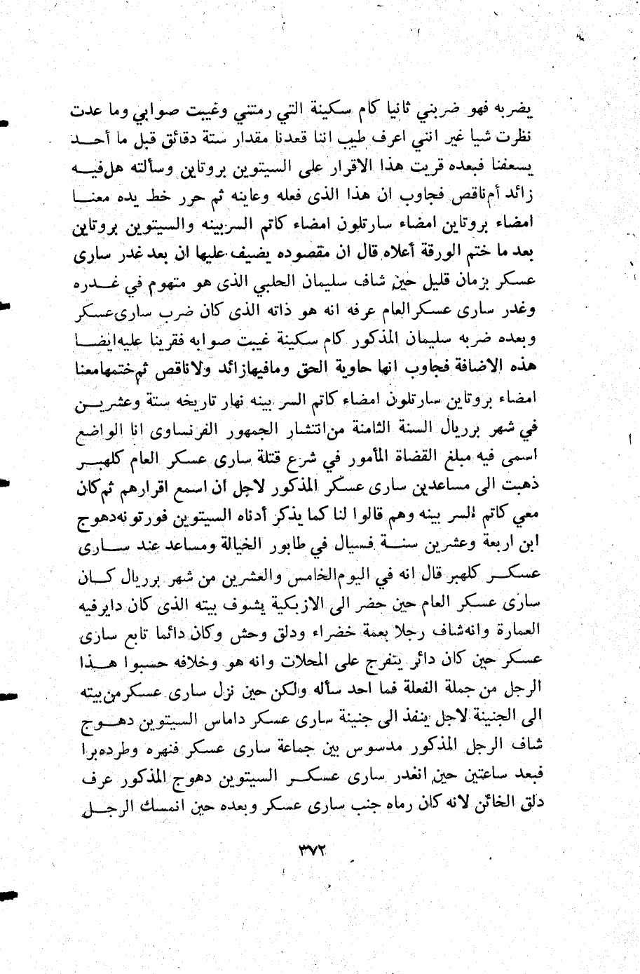 يضربه فهو ضربني ثانيا كام سكينة التي رمتني وغيبت صوابي وما وعدت نظرت شيا غير انني اعرف طبيب اننا قعدنا مقدار ستة دقائق قبل ما أجد يسعفنا فبعده قريت هذا الإقرار على السيتوين بروتاين وسألته هل فيه زائد أم ناقص فجاوب أن هذا الذي فعله وعاينه ثم حرر خط يده معنا إمضاء بروتاين امضاء سارتلون امضاء كاتم السربينه والسيتوين بروتاين بعد ما ختم الورقة أعلاه قال: إن مقصوده يضيف عليها أن بعد غدر سارى عسكر بزمان قليل حين شاف سليمان الحلبي الذي هو ذاته الذي كان ضرب سارى عسكر وبعده ضربه سليمان المذكور كام سكينة غيبت صوابه فقرينا عليه أيضا هذه الاضافة فجاوب أنها حاوية الحق وما فيها زائد ولا ناقص ثم ختمها معنا أمضاء بروتاين سارتلون إمضاء كاتم السر بينه نهار تاريخه سنة وعشرين في شهر برريال السنة الثامنة من انتشار الجمهور الفرنساوي أنا الواضع اسمي فيه مبلغ القضاة المأمور في شرع قتلة سارى عسكر العام كلهبر ذهبت إلى مساعدين سارى عسكر المذكور لأجل أن اسمع اقرارهم ثم كان معي كاتم السر بينه وهم قالوا لنا كما يذكر أدناه السيتوين فورتونه دهوج ابن أربعة وعشرين سنة فسيال في طابور الخيالة ومساعد عند سارى عسكر كلهبر قال: إنه في اليوم الخامس والعشرين من شهر برريال كان سارى عسكر العام حين حضر إلى الأزبكية يشوف بيته الذي كان داير فيه العمارة وأنه شاف رجلا بعمة خضراء ودلق وحش وكان دائما تابع سارى عسكر حين كان دائر يتفرج على المحلات وأنه هو وخلافه حسبوا هذا الرجل من جملة الفعلة فما أجد سأله ولكن حين نزل سارى عسكر من بيته إلى الجنينة لأجل ينفذ إلى جنينة سارى عسكر داماس السيتوين دهوج شاف الرجل المذكور مدسوس بين جماعة سارى عسكر فنهره وطرده برا فبعد ساعتين حين انغدر سارى عسكر السيتوين دهوج المذكور عرف دلق الخائن لأنه كان رماه جنب سارى عسكر وبعده حين انمسك الرجل