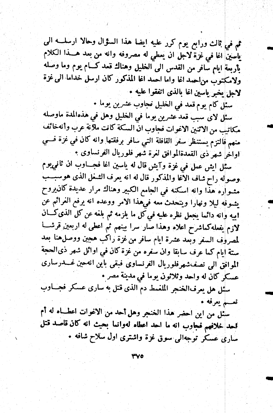 سئل ايش عمل في غزة وآيش قال له ياسين اغا فجاوب أن ثاني يوم وصوله راح شاف الاغا والمذكور قال له أنه يعرف الشغل الذي هو سبب مشواره هذا وأنه اسكنه في الجامع الكبير وهناك مرار عديدة كان يروح يشوفه ليلا ونهارا ويتحدث معه في هذا الأمر ووعده أنه يرفع الغرائم عن ابيه وأنه دائما يجعل نظره عليه في كل ما يلزمه ثم بلغه عن كل الذي كان لازم يفعله كما شرح أعلاه وهذا صار سرا بينهم ثم أعطى له أربعين قرشا لمصروف السفر وبعد عشرة أيام سافر من غزة راكب هجين ووصل هنا بعد ستة أيام كما عرف سابقا وأن سفره من غزة كان في أوائل شهر ذي الحجة الموافق إلى نصف شهر فلوريال الفرنساوي فبقى باين أنه حين غدر سارى عسكر كان له واحد وثلاثون يوما في مدينة مصر.