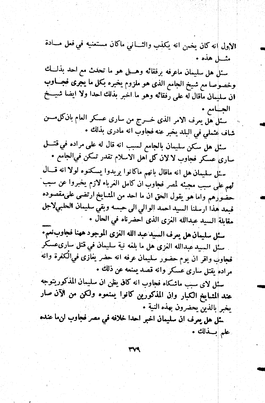 سئل السيد عبد الله الغزي هل ما بلغه نية سليمان في قتل سارى عسكر فجاوب وأقر أن يوم حضور سليمان عرفه أنه حضر يغازي في الكفرة وأنه مراده يقتل سارى عسكر وأنه قصد يمنعه عن ذلك.