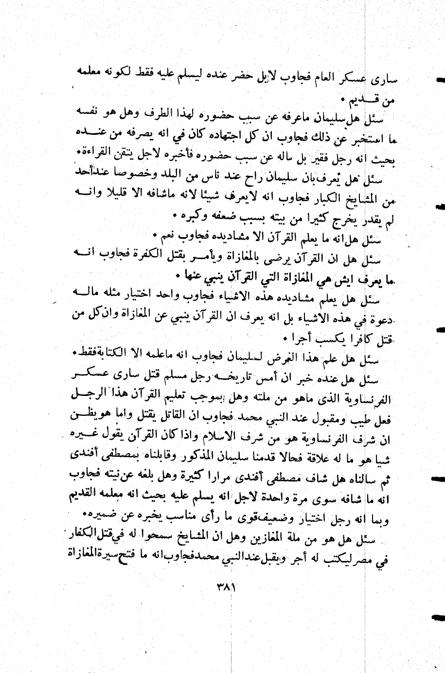 سئل هل عنده خبر أن أمس تاريخه رجل مسلم قتل سارى عسكر الفرنساوية الذي ما هو من ملته وهل بموجب تعليم القرآن هذا الرجل فعل طيب ومقبول عند النبي محمد فجاوب أن القاتل يقتل وأما هو يظن أن شرف الفرنساوية هو من شرف الإسلام وإذا كان القرآن يقول غيره شيا هو ما له علاقة فحالا قدمنا سليمان المذكور وقابلناه بمصطفى أفندي ثم سالناه هل شاف مصطفى أفندي مرارا كثيرة وهل بلغه عن نيته فجاوب أنه ما شافه سوى مرة واحدة لأجل أنه يسلم عليه بحيث أنه معلمه القديم.
