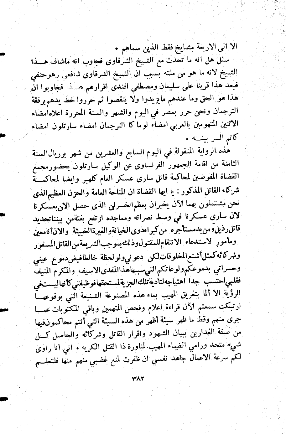 هذه الرواية المنقولة في اليوم السابع والعشرين من شهر برريال السنة الثامنة من إقامة الجمهور الفرنساوي عن الوكيل سارتلون بحضور مجمع القضاة المفوضين لمحاكمة قاتل سارى عسكر العام كلهبر وأيضا لمحاكمة شركاء القاتل المذكور يا ايها القضاة أن المناحة العامة والحزن العظيم الذي نحن مشتملون بهما الآن يخبران بعظم الخسران الذي حصل الآن بعسكرنا لأن سارى عسكرنا في وسط نصراته ومماجده ارتفع بغتة من بيننا تحديد قاتل رذيل ومن يد مستأجره من كبراء ذوي الخيانة والغيرة الخبيثة والان أنا معين ومأمور لاستدعاء الانتقام للمقتول وذلك بموجب الشريعة من القاتل المسفور وشركائه كمثل أشنع المخلوقات لكن دعوني ولو لحظة خالطا فيض دموع عيني وحسراتي بدموعكم ولوعاتكم التي سببها هذا المفدى الأسيف والمكرم المنيف فقلبي احتسب جدا اهتياجه لتأدية تلك الجزية لمستحقها فوظيفتي كأنها ليست في الرؤية إلا الما بتغريق المهيب بماء هذه المصنوعة الشنيعة التي بوقوعها ارتبكت سمعتم الآن قراءة أعلام وفحص المتهمين وباقي المكتوبات عما جرى منهم وقط ما ظهر سيئة أظهر من هذه السيئة التي أنتم محاكمون فيها من صفة الغدارين ببيان الشهود واقرار القاتل وشركائه والحاصل كل شيء متحد ورامي الضياء المهيب لمناورة ذا القتل الكريه إني أنا راوي لكم سرعة الأعمال جاهد نفسي أن ظفرت لمنع غضبي منهم منها فلتعلم