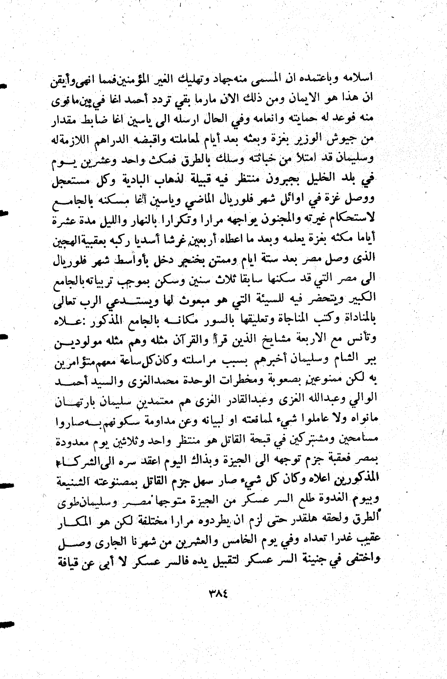 إسلامه وباعتمده أن المسمى منه جهاد وتهليك الغير المؤمنين فمما أنهى وأيقن أن هذا هوالايمان ومن ذلك الآن مارما بقي تردد أحمد اغا في بين ما نوى منه فوعد له حمايته وانعامه وفي الحال ارسله إلى ياسين اغا ضابط مقدار من جيوش الوزير بغزة وبعثه بعد أيام لمعاملته وأقبضه الدراهم اللازمة له وسليمان قد امتلأ من خباثته وسلك بالطرق فمكث واحد وعشرين يوم في بلد الخليل يجبرون منتظر فيه قبيلة لذهاب البادية وكل مستعجل ووصل غزة في أوائل شهر فلوريال الماضي وياسين اغا مسكنه بالجامع لاستحكام غيرته والمجنون يواجهه مرارا وتكرارا بالنهار والليل مدة عشرة أياما مكثه بغزة يعلمه وبعد ما أعطاه أربعين غرشا أسديا ركبه بعقبيه الهجين الذي وصل مصر بعد ستة أيام وممتن بخنجر دخل بأواسط شهر فلوريال إلى مصر التي قد سكنها سابقا ثلاث سنين وسكن بموجب تربياته بالجامع الكبير ويتحضر فيه للسيئة التي هو مبعوث لها ويستدعي الرب تعالى بالمناداة وكتب المناجاة وتعليقها بالسور مكانه بالجامع المذكور علاه وتأنس مع الأربعة مشايخ الذين قرأ والقرآن مثله وهم مثل مولودين ببر الشام وسليمان أخبرهم بسبب مراسلته وكان كل ساعة معهم متؤامرين به لكن ممنوعين بصعوبة ومخطرات الوحدة محمد الغزي والسيد أحمد الوالي وعبد الله الغزي وعبد القادر الغزي هم معتمدين سليمان بارتهان ما نواه ولا عاملوا شيء لممانعته أو لبيانه وعن مداومة سكونهم به صاروا مسامحين ومشتركين في قبحة القاتل هو منتظر واحد وثلاثين يوم معدودة بمصر فعقبة جزم توجهه إلى الجيزة وبذاك اليوم اعقد سره إلى الشركاء المذكورين أعلاه وكان كل شيء صار سهل جزم القاتل بمصنوعته الشنيعة وبيوم الغدوة طلع السر عسكر من الجيزة متوجها مصر وسليمان طوى الطرق ولحقه هلقدو حتى لزم أن يطروده مرارا مختلفة لكن هو المكار عقيب غدرا تعداه وفي يوم الخامس والعشرين من شهرنا الجاري وصل واختفى في جنينة السر عسكر لتقبيل يده فالسر عسكر لا أبي عن قيافة
