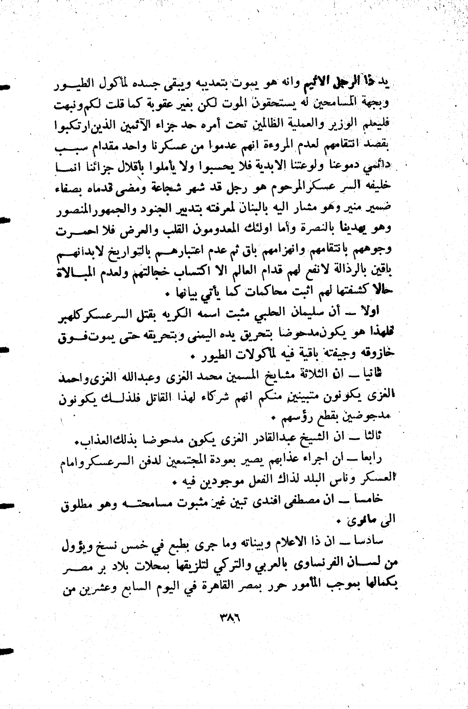 يد ذا الرجل الاثيم وأنه هو يموت بتعذيبه ويبقى جسده لمأكول الطيور وبجهة المسامحين له يستحقون الموت لكن بغير عقوبة كما قلت لكم ونبهت فليعلم الوزير والعملية الظالمين تحت أمره حد جزاء الآثمين الذين ارتكبوا بقصد انتقامهم لعدم المروءة أنهم عدموا من عسكرنا واحد مقدام سبب دائمي دموعنا ولوعتنا الأبدية فلا يحسبوا ولا يأملوا بأقلال جزائنا إنما خليفة السر عسكر المرحوم هو رجل قد شهر شجاعة ومضى قدماه بصفاء ضمير منير وهو مشار إليه بالبنان لمعرفة بتدبير الجنود والجمهور المنصور وهو يهدينا بالنصرة وأما أولئك المعدومون القلب والعرض فلا احمرت وجوههم بانتقامهم وأنهزامهم باق ثم عدم اعتبارهم بالتواريخ لا بد أنهم باقين بالرذالة لا نفع لهم قدام العالم إلا اكتساب خجالتهم ولعدم المبالاة حالا كشفتها لهم اثبت محاكمات كما يأتي بيانها.