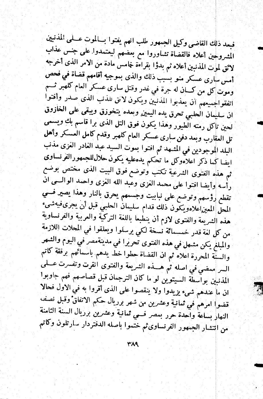 فبعد ذلك القاضي وكيل الجمهور طلب أنهم يفتوا بالموت على المذنبين المشروحين أعلاه فالقضاة تشاوروا مع بعضهم ليعتمدوا على جنس عذاب لائق لموت المذنبين أعلاه ثم بدؤا بقراءة خامس مادة من الأمر الذي اخرجه امس سارى عسكر منو بسبب ذل والذي بموجبه أقامهم قضاة في فحص وموت كل من كان له جرة في غدر وقتل سارى عسكر العام كلهبر ثم اتفقوا جميعهم أن يعذبوا المذنبين ويكون لائق للذنب الذي صدر وأفتوا أن سليمان الحلبي تحرق يده اليمين وبعده يتخوزق ويبقى على الخازوق لحين تأكل رمته الطيور وهذا يكون فوق التل الذي برا قاسم بك ويسمى تل العقارب وبعد دفن سارى عسكر العام كلهبر وقدام كامل العسكر وأهل البلد الموجودين في المشهد ثم أفتوا بموت السيد عبد الغادر الغزى مذنب أيضا كما ذكر أعلاه وكل ما تحكم يده عليه يكون حلال للجمهور الفرنساوي ثم هذه الفتوى الشرعية تكتب وتوضع فوق البيت الذي مختص بوضع رأسه وأيضا افتوا على محمد الغزى وعبد الله وأحمد الوالي أن تقطع رؤسهم وتوضع على نبابيت وجسمهم يحرق بالنار وهذا يصير في المحل المعين أعلاه ويكون ذلك قدام سليمان الحلبي قبل أن يجري فيه شيء هذه الشريعة والفتوى لازم أن ينطبعا باللغة التركية والعربية والفرنساوية من كل لغة قدر خمسمائة نسخة لكي يرسلوا ويعلقوا في المحلات اللازمة والمبلغ يكن مشهل في هذه الفتوى تحريرا في مدينة مصر في اليوم والشهر والسنة المحررة أعلاه ثم أن القضاة حطوا خط يدهم باسمائهم برفقة كاتم السر ممضى في اصله ثم هذه الشريعة والفتوى انقرت وتفسرت على المذنبين بواسطة السيتوين لو ما كان الترجمان قبل قصاصهم فهم جاوبوا أن ما عندهم شيء يزيدوا ولا ينقصوا على الذي أقروا به في الأول فحالا قضوا أمرهم في ثمانية وعشرين من شهر برريال حكم الاتفاق وقبل نصف النهار بساعة واحدة حرر بمصر في ثمانية وعشرين برريال السنة الثامنة من انتشار الجمهور الفرنساوي ثم ختموا باصله الدفتردار سارتلون وكاتم