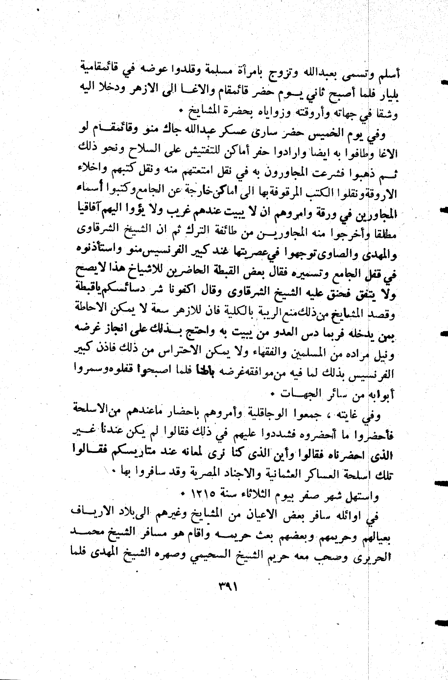 وفي يوم الخميس حضر سارى عسكر عبد الله جاك منو وقائمقام لو الاغا وطافوا به أيضا وأرادوا حفر أماكن للتفتيش على السلاح ونحو ذلك ثم ذهبوا فشرعت المجاورون به في نقل امتعتهم منه هو نقل كتبهم واخلاء الاروقة ونقلوا الكتب الموقوفة بها إلى أماكن خارجة عن الجامع وكتبوا أسماء المجاورين في ورقة وأمروهم أن لا يبيت عندهم غريب ولا يؤوا إليهم آفاقيا مطلقا وأخرجوا منه المجاورين من طائفة الترك ثم أن الشيخ الشرقاوي والمهدي والصاوي توجهوا في عصريتها عند كبير الفرنسيس منو وأستاذ نوه في قفل الجامع وتسميره فقال بعض القبطة الحاضرين للاشياخ هذا لا يصح ولا يتفق فحنق عليه الشيخ الشرقاوي وقال اكفونا شر دسائسكم ياقبطة وقصد المشايخ من ذلك منع الريبة بالكلية فإن للأزهر سعة لا يمكن الاحاطة بمن يدخل فربما دس العدو من يبيت به واحتج بذلك على انجاز غرضه ونيل مراده من المسلمين والفقهاء ولا يمكن الاحتراس من ذلك فاذن كبير الفرنسيس بذلك لما فيه من موافقة غرضه باطنا فلما أصبحوا قفلوه وسمروا أبوابه من سائر الجهات.
