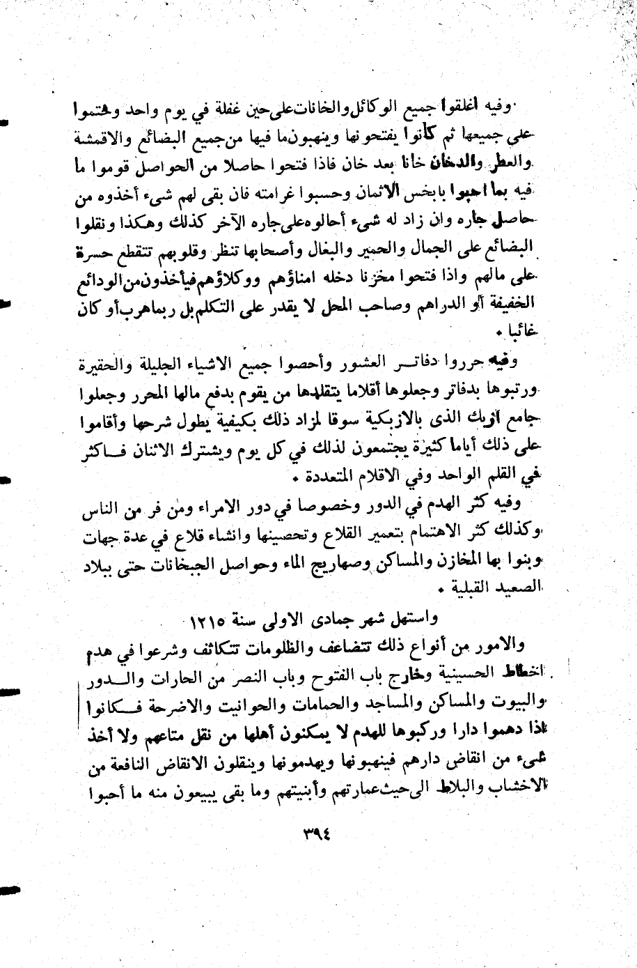 وفيه أغلقوا جميع الوكائل والخانات على حين غفلة في يوم واحد وختموا على جميعها ثم كانوا يفتحونها وينهبون ما فيها من جميع البضائع والاقمشة والعطر والدخان خانا بعد خان فإذا فتحوا حاصلا من الحواصل قوموا ما فيه بما احبوا بابخس الاثمان وحسبوا غرامته فإن بقى لهم شيء أخذوه من حاصل جاره وإن زاد له شيء أحالوه علىجاره الآخر كذلك وهكذا ونقلوا البضائع على الجمال والحمير والبغال وأصحابها تنظر وقلوبهم تنقطع حسرة على مالهم وإذا فتحوا مخزنا دخله امناؤهم ووكلاؤهم فيأخذون من الودائع الخفيفة أو الدراهم وصاحب المحل لا يقدر على التكلم بل ربما هرب أو كان غائبا.
