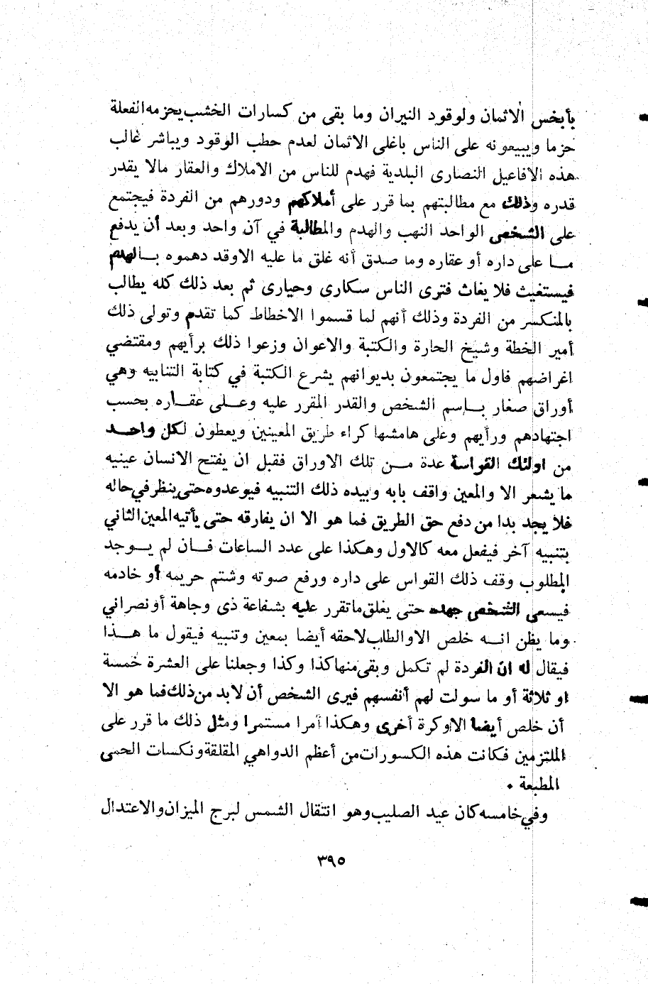 بأبخس الأثمان ولوقود النيران وما بقى من كسارات الخشب يحزمه الفعلة حزما ويبيعونه على الناس باغلى الاثمان لعدم حطب الوقود ويباشر غالب هذه الافاعيل النصارى البلدية فهدم للناس من الأملاك والعقار ما لا يقدر قدره وذلك مع مطالبتهم بما قرر على أملاكهم ودورهم من الفردة فيجتمع على الشخص الواحد النهب والهدم والمطالبة في أن واحد وبعد أن يدفع ما على داره أو عقاره وماصدق أنه غلق ما عليه إلا وقد دهموه بالهدم فيستغيث فلا يغاث فترى الناس سكارى وحيارى ثم بعد ذلك كله يطالب بالمنكسر من الفردة وذلك أنهم لما قسموا الاخطاط كما تقدم وتولى ذلك أمير الخطة وشيخ الحارة والكتبة والأعوان وزعوا ذلك برأيهم ومقتضى أغراضهم فأول ما يجتمعون بديوانهم يشرع الكتبة في كتابة التنابيه وهي أوراق صغار باسم الشخص والقدر المقرر عليه وعلى عقاره بحسب اجتهادهم ورأيهم وعلى هامشها كراء طريق المعينين ويعطون لكل واحد من أولئك القراسة عدة من تلك الأوراق فقبل أن يفتح الإنسان عينيه ما يشعر إلا والمعين واقف بابه وبيده ذلك التنبيه فيوعدوه حتى ينظر في حاله فلا يحد بدا من دفع حق الطريق فما هو إلا أن يفارقه حتى يأتيه المعين الثاني بتنبيه آخر فيفعل معه كالاول وهكذا على عدد الساعات فإن لم يوجد المطلوب وقف ذلك القواس على داره ورفع صوته وشتم حريمه أو خادمه فيسعى الشخص جهده حتى يغلق ما تقرر عليه بشفاعة ذي وجاهة أو نصراني وما يظن أنه خلص إلا والطلب لاحقه أيضا بمعين وتنبيه فيقول ما هذا فيقال له أن الفردة لم تكمل وبقى منها كذا وكذا وجعلنا على العشرة خمسة أو ثلاثة أو ما سولت لهم أنفسهم فيرى الشخص أن لا بد من ذلك فما هو إلا أن خلص أيضا الاوكرة أخرى وهكذا أمرا مستمرا ومثل ذلك ما قرر على الملتزمين فكانت هذه الكسورات من أعظم الدواهي المقلقة ونكسات الحمى المطبعة.