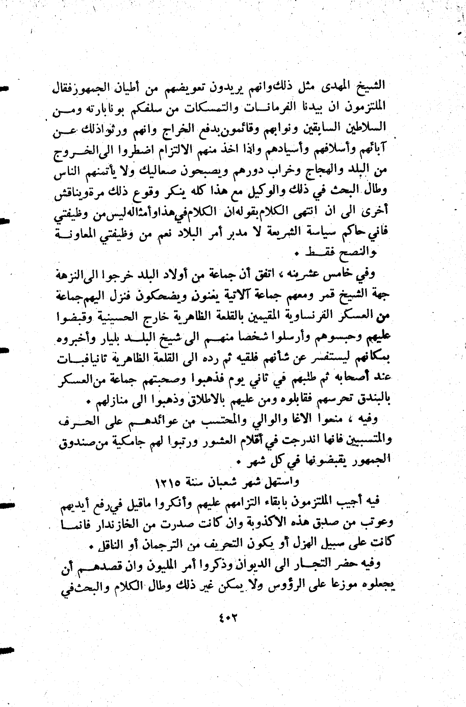 الشيخ المهدي مثل ذلك وأنهم يريدون تعويضهم من أطيان الجمهور فقال الملتزمون أن بيدنا الفرمانات والتمسكات من سلفكم بونابارته ومن السلاطين السابقين ونوابهم وقائمون بدفع الخراج وأنهم ورثوا ذلك عن آبائهم وأسلافهم وأسيادهم وإذا أخذ منهم الالتزام اضطروا إلى الخروج من البلد والهجاج وخراب دورهم ويصبحون صعاليك ولا يأتمنهم الناس وطالب البحث في ذلك والوكيل مع هذا كله ينكر وقوع ذلك مرة ويناقش أخرى إلى أن انتهى الكلام بقوله له أن هذا الكلام في هذا وأمثاله ليس من وظيفتي فإني حاكم سياسة الشريعة لا مدبر أمر البلاد نعم من وظيفتي المعاونة والنصح فقط.