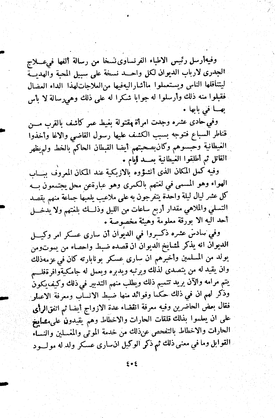 وفي سادس عشرة ذكروا في الديوان أن سارى عسكر أمر وكيل الديوان أن يذكر لمشايخ الديوان أن قصده ضبط واحصاء من يموت ومن يولد من المسلمين وأخبرهم أن سارى عسكر بونابارته كان في عزمه ذلك وأن يقيد له من يتصدى لذلك ويرتبه ويدبره ويعمل له جامكية وافرة فلم يتم مرامه والان يريد تتميم ذلك ويطلب منهم التدبير في ذلك وكيف يكون وذكر لهم أن في ذلك حكما وفوائد منها ضبط الإنساب ومعرفة الأعمار فقال بعض الحاضرين وفيه معرفة انقضاء عدة الأزواج أيضا ثم اتفق الرأي على أن يعلموا بذلك قلقات الحارات واخطاط وهم يقيدون على مشايخ الحارات والاخطاط بالتفحص عن ذلك من خدمة الموتى والمغسلين والنساء القوابل وما في معنى ذلك ثم ذكر الوكيل أن سارى عسكر ولد له مولود
