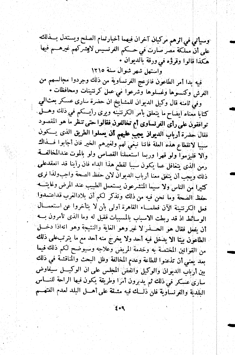 وفي ثامنه قال وكيل الديوان للمشايخ أن حضرة سارى عسكر بعث إلى كتابا معناه أيضاح ما يتعلق بأمر الكرنتينه ويرى رأيكم في ذلك وهل توافقون على رأي الفرنساوي أم تخالفون فقالوا حتى تنظر ما هو المقصود فقال حضرة أرباب الديوان يجب عليهم أن يعملوا الطريق الذي يكون سببا لانقطاع هذه العلة فاننا نبغي لهم ولغيرهم الخير فإن أجابوا فذاك والا فليزموا ولو قهرا وربما استعملنا القصاص ولو بالموت عند المخالفة ومن الذي يتغافل عما يكون سببا لقطع هذا الداء فإن رأينا قدانعقد على ذلك ويجب أن يتفق معنا أرباب الديوان لأن حفظ الصحة واجب ولذا نرى كثيرا من الناس ولا سيما المتشرعون يستعمل الطبيب عند المرض وغايته حفظ الصحة وما نحن فيه من ذلك ونذكر لكم أن بلاد الغرب قد اعتمدوا فعل الكرنتينة الآن فعلماء القاهرة أولى بأن لا يتأخروا عن استعمال الوسائط إذ قد ربطت الأسباب بالمسببات فقيل له وما الذي تأمرون به أن يفعل فقال هو الحذر لا غير وهو الغاية والنتيجة وهو أنه إذا دخل الطاعون بيتا إلا يدخل فيه أجد ولا يخرج منه أجد مع ما يترتب على ذلك من القوانين المختصة به وخدمة المريض وعلاجه وسيوضح لكم ذلك فيما بعد يعني أن تذعنوا للطاعة وعدم المخالفة وظل البحث والمناقشة في ذلك بين أرباب الديوان والوكيل وانفض المجلس على أن الوكيل سيفاوض سارى عسكر في ذلك ثم يدبرون أمرا وطريقة يكون فيها الراحة للناس البلدية والفرنساوية فإن ذلك فيه مشقة على أهل البلد لعدم الفتهم