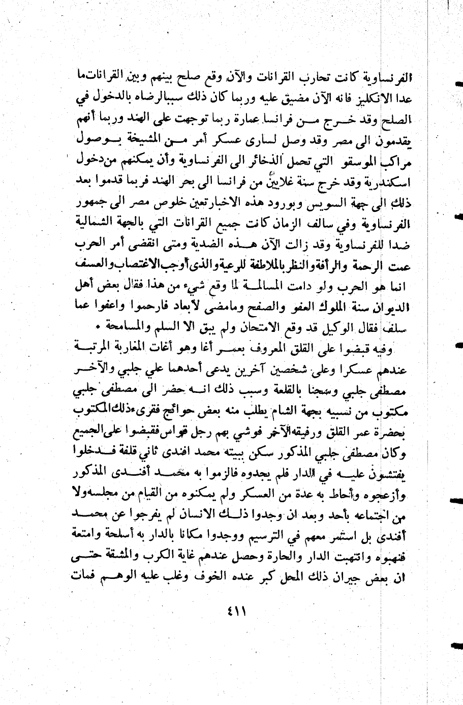 الفرنساوية كانت تحارب القرانات والآن وقع صلح بينهم وبين القرانات ما عدا الانكليز فإنه الآن مضيق عليه وربما كان ذلك سببا لرضاه بالدخول في الصلح وقد خرج من فرانسا عمارة ربما توجهت على الهند وربما أنهم يقدمون إلى مصر وقد وصل لسارى عسكر أمر من المشيخة بوصول مراكب الموسقو التي تحمل الذخائر إلى الفرنساوية وأن يمكنهم من دخول اسكندرية وقد خرج سنة غلايين من فرانسا إلى بحر الهند فربما قدموا بعد ذلك إلى جهة السويس وبورود هذه الأخبار تعين خلوص مصر إلى جمهور الفرنساوية وفي سألف الزمان كانت جميع القرانات التي بالجهة الشمالية ضدا للفرنساوية وقد زالت الآن هذه الضدية ومتى انقضى أمر الحرب عمت الرحمة والرأفة والنظر بالملاطفة للرعية والذي أوجب الاغتصاب والعسف إنما هو الحرب ولو دامت المسالمة لما وقع شيء من هذا فقال بعض أهل الديوان سنة الملوك العفو والصفح وما مضى لابعاد فارحموا واعفوا عما سلف فقال الوكيل قد وقع الأمتحان ولم يبق إلا السلم والمسامحة.