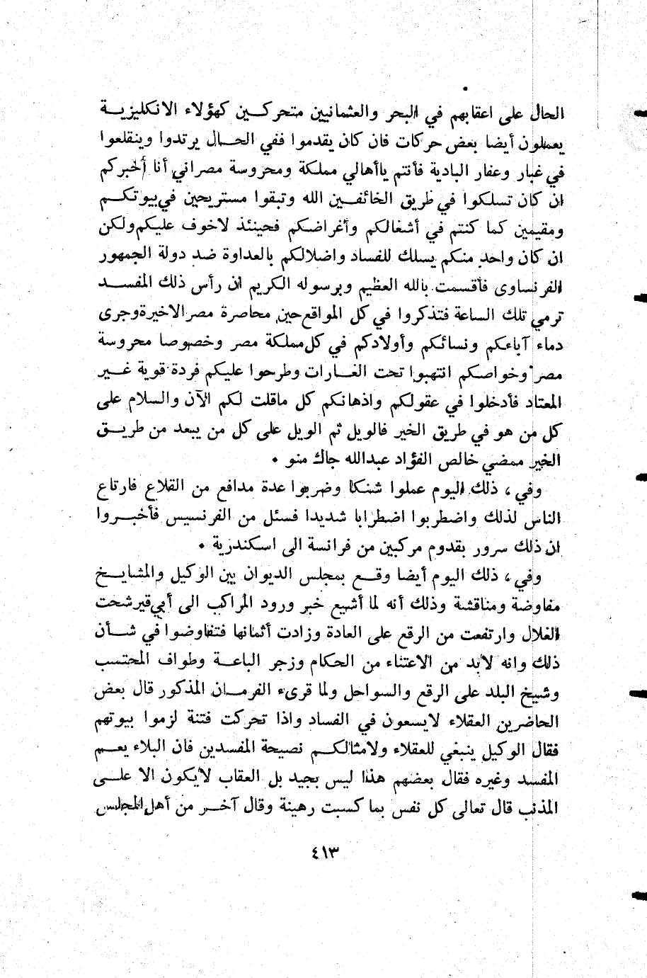 الحال على اعقابهم في البحر والعثمانيين متحركين كهؤلاء الانكليزية يعلمون أيضا بعض حركات فإن كان يقدموا ففي الحال يرتدوا وينقلعوا في غبار وعفار البادية فأنتم يا أهالي مملكة ومحروسة مصراني أنا أخبركم أن كان تسلكوا في طريق الخائفين الله وتبقوا مستريحين في بيوتكم ومقيمين كما كنتم في أشغالكم وأغراضكم فحينئذ لا خوف عليكم ولكن أن كان واحد منكم يسلك للفساد واضلالكم بالعداوة ضد دولة الجمهور الفرنساوي فأقسمت بالله العظيم وبرسوله الكريم أن رأس ذلك المفسد ترمي تلك الساعة فتذكروا في كل المواقع حين محاصرة مصر الاخيرة وجرى دماء آبائكم ونسائكم وأولادكم في كل مملكة مصر وخصوصا محروسة مصر وخواصكم انتهبوا تحت الغارات وطرحوا علكيم فردة قوية غير المعتاد فأدخلوا في عقولكم واذهانكم كل ما قلت لكم الآن والسلام على كل من هو في طريق الخير فالويل ثم الويل على كل من يبعد من طريق الخير ممضي خالص الفؤاد عبد الله جاك منو.