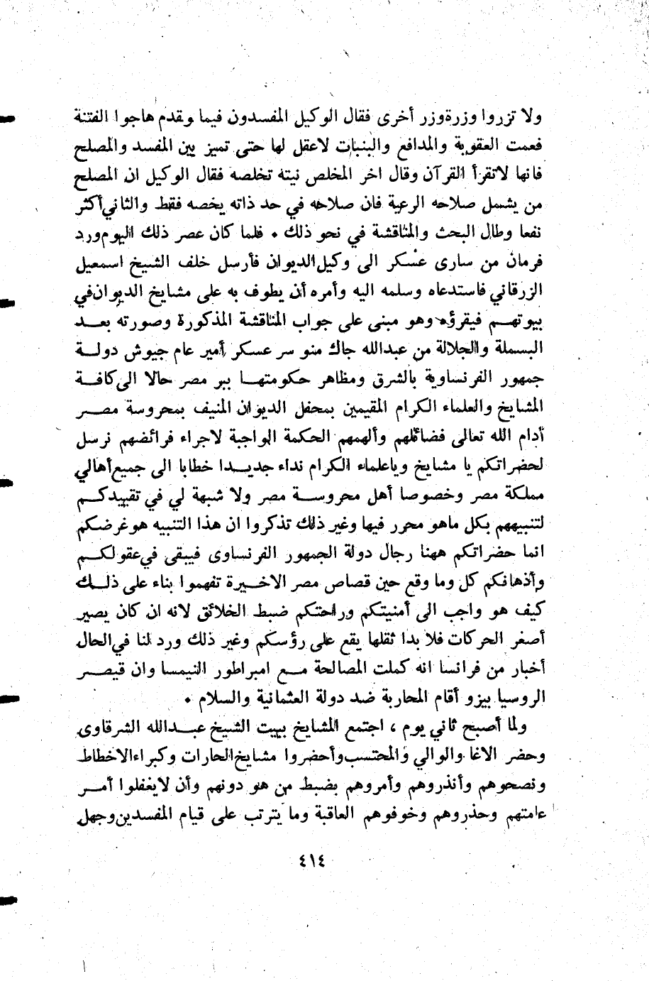 ولا تزروا وزرة وزر أخرى فقال الوكيل: المفسدون فيما وقدم هاجوا الفتنة فعمت العقوبة والمدافع والبنبات لا عقل لها حتى تمير بين المفسد والمصلح فإنه لا تقرأ القرآن وقال آخر: المخلص نيته تخلصه فقال الوكيل: إن المصلح من يشمل صلاحه الرعية فإن صلاحه في حد ذاته يخصه فقط والثاني أكثر نفعا وطال البحث والمناقشة في نحو ذلك فلما كان عصر ذلك اليوم ورد فرمان من سارى عسكر إلى وكيل الديوان فأرسل خلف الشيخ إسمعيل الزرقاني فاستدعاه وسلمه إليه وأمره أن يطوف به على مشايخ الديوان في بيوتهم فيقرؤه وهو مبنى على جواب المناقشة المذكورة وصورته بعد البسملة والجلالة من عبد الله جاك منو سر عسكر أمير عام جيوش دولة جمهور الفرنساوية بالشرق ومظاهر حكومتها ببر مصر حالا إلى كافة المشايخ والعلماء الكرام المقيمين بمحفل الديوان المنيف بمحروسة مصر أدام الله تعالى فضائلهم وألهمهم الحكمة الواجبة لاجراء فرائضهم نرسل لحضراتكم يا مشايخ ويا علماء الكرام نداء جديد خطابا إلى جميع أهالي مملكة مصر وخصوصا أهل محروسة مصر ولا شبهة لي في تقييدكم لتنبيههم بكل ما هو محرر فيها وغير ذلك تذكروا أن هذا التنبيه هو غرضكم إنما حضراتكم ههنا رجال دولة الجمهور الفرنساوي فيبقى في عقولكم وأذهانكم كل وما وقع حين قصاص مصر الاخيرة تفهموا بناء على ذلك كيف هو واجب إلى أمنيتكم وراحتكم ضبط الخلائق لأنه أن كان يصير أصغر الحركات فلا بدا ثقلها يقع على رؤسكم وغير ذلك ورد لنا في الحال أخبار من فرانسا أنه كملت المصالحة مع امبراطور النيمسا وأن قيصر الروسيا بيزو أقام المحاربة ضد دولة العثمانية والسلام.