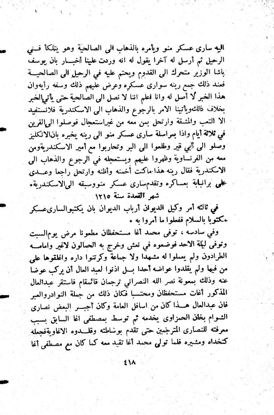 إليه سارى عسكر منو ويأمره بالذهاب إلى الصالحية وهو يتلكأ في الرحيل ثم أرسل له آخرا يقول له: إنه وردت علينا أخبار بأن يوسف باشا الوزير متحرك إلى القدوم ويحتم عليه في الرحيل إلى الصالحية فعند ذلك جمع رينه سوارى عسكره وعرض عليهم ذلك وسفه رأيه وأن هذا الخبر لا أصل له وأنا أعلم اننا لا نصل إلى الصالحية حتى يأتي الخبر بخلاف ذلك ويأتينا الأمر بالرجوع والذهاب إلى الأسكندرية فلا نستفيد إلا التعب والمشقة وارتحل بمن معه من غير استعجال فوصلوا إلى القرين في ثلاثة أيام وإذا بمراسلة سارى عسكر منو إلى رينه يخبره بأن الانكليز وصلوا إلى أبي قير وطلعوا إلى البر وتحاربوا مع أمير الأسكندرية ومن معه من الفرنساوية وظهروا عليهم ويستعجله في الرجوع والذهاب إلى الأسكندرية فقال رينه هذا ما كنت أخمنه وأظنه وارتحل راجعا وعدي على برانبابة بعساكره وتقدم سارى عسكر منو وسبقه إلى الأسكندرية.