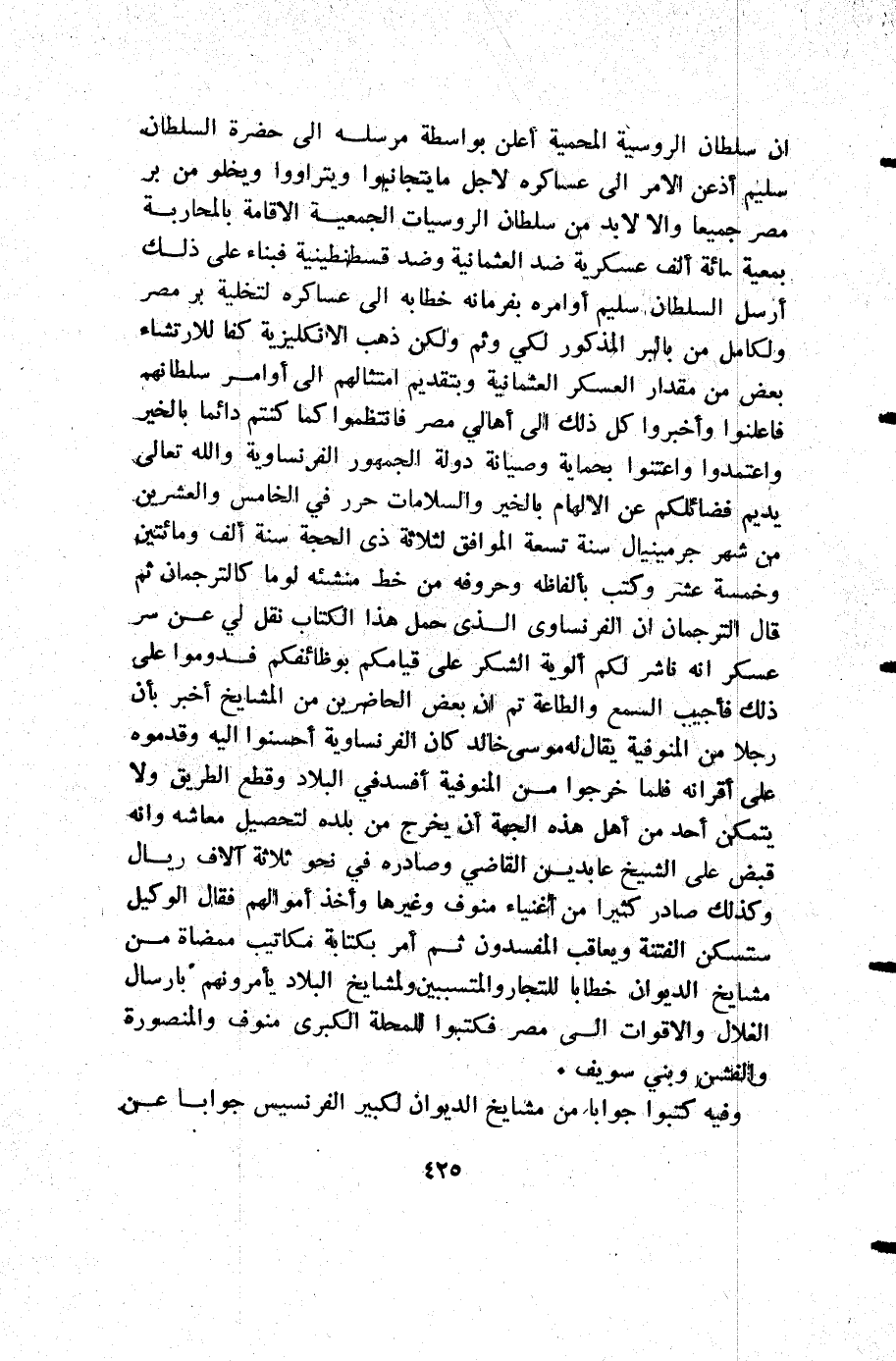 أن سلطان الروسية المحمية أعلن بواسطة مرسله إلى حضرة السلطان سليم أذعن الأمر إلى عساكره لأجل ما يتجانبوا ويتراووا ويخلو من بر مصر جميعا والا لابد من سلطان الروسيات الجمعية الإقامة بالمحاربة بمعية مائة ألف عسكرية ضد العثمانية وضد قسطنطينية فبناء على ذلك أرسل السلطان سليم أوامره بفرمانه خطابه إلى عساكره لتخلية بر مصر ولكامل من بالبر المذكور لكي وثم ولكن ذهب الانكليزية كفا للارتشاء بعض من مقدار العسكر العثمانية وبتقديم امتثالهم إلى أوامر سلطانهم فاعلنوا وأخبروا كل ذلك إلى أهالي مصر فانتظموا كما كنتم دائما بالخير واعتمدوا واعتنوا بحماية وصيانة دولة الجمهور الفرنساوية والله تعالى يديم فضائلكم عن الالهام بالخير والسلامات حرر في الخامس والعشرين من شهر جرمينيال سنة تسعة الموافق لثلاثة ذي الحجة سنة ألف ومائتين وخمسة عشر وكتب بألفاظه وحروفه من خط منشئه لوما كالترجمان ثم قال الترجمان أن الفرنساوي الذي حمل هذا الكتاب نقل لي عن سر عسكر أنه ناشر لكم ألوية الشكر على قيامكم بوظائفكم فدوموا على ذلك فأجيب السمع والطاعة تم أن بعض الحاضرين من المشايخ أخبر بأن رجلا من المنوفية يقال له موسى خالد كان الفرنساوية أحسنوا إليه وقدموه على أقرانه فلما خرجوا من المنوفية أفسد في البلاد وقطع الطريق ولا يتمكن أجد من أهل هذه الجهة أن يخرج من بلده لتحصيل معاشه وأنه قبض على الشيخ عابدين القاضي وصادره في نحو ثلاثة آلاف ريال وكذلك صادر كثيرا من أغنياء منوف وغيرها وأخذ أموالهم فقال الوكيل: ستسكن الفتنة ويعاقب المفسدون ثم أمر بكتابة مكاتيب ممضاة من مشايخ الديوان خطابا للتجار والمتسببين ولمشايخ البلاد يأمرونهم بإرسال الغلال والاقوات إلى مصر فكتبوا للمحلة الكبرى منوف والمنصورة والفشن وبني سويف.