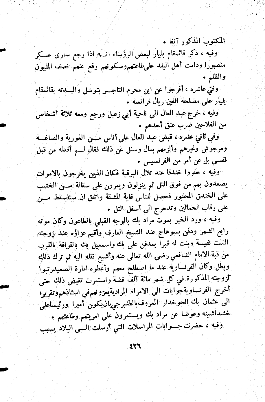 وفي ثاني عشرة قبض عبد العال على أناس من الغورية والصاغة ومرجوش وغيرهم وألزمهم بمال وسئل عن ذلك فقال لم أفعله من قبل نفسي بل عن أمر من الفرنسيس.