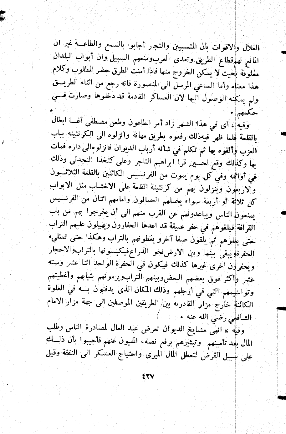 وفيه أي في هذا الشهر زاد أمر الطاعون وطعن مصطفى أغا أبطال بالقلعة فلما ظهر فيه ذلك رفعوه بطريق مهانة وأنزلوه إلى الكرنتينه بباب العزب وألقوه بها ثم تكلم في شأنه أرباب الديوان فانزلوه إلى داره فمات بها وكذلك وقع لحسين قرأ إبراهيم التاجر وعلى كتخدا النجدلي وذلك في أوائله وفي كل يوم يموت من الفرنسيس الكائنين بالقلعة الثلاثون والاربعون وينزلون بهم من كرنتينة القلعة على الاخشاب مثل الأبواب كل ثلاثة أو أربعة سواء يحملهم الحمالون وامامهم اثنان من الفرنسيس يمنعون الناس ويباعدونهم عن القرب منهم إلى أن يخرجوا بهم من باب القرافة فيلقوهم في حفر عميقة قد اعدها الحفارون ويهيلون عليهم التراب حتى يعلوهم ثم يلقون صفا آخر ويغطونهم بالتراب وهكذا حتى تمتلىء الحفرة ويبقى بينها وبين الأرض نحو الذراع فيكبسونها بالتراب والاحجار ويحفرون أخرى غيرها كذلك فيكون في الحفرة الواحد اثنا عشر وستة عشر وأكثر فوق بعضهم البعض وبينهم التراب ويرمونهم بثيابهم وأغطيتهم وتواسيمهم التي في أرجلهم وذلك المكان الذي يدفنون به في العلوة الكائنة خارج مزار القادرية بين الطريقين الموصلين إلى جهة مزار الإمام الشافعي رضي الله عنه.