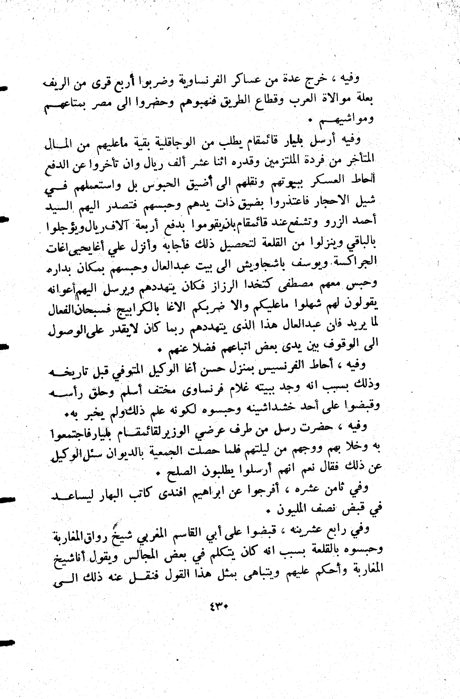 وفيه أرسل بليار قائمقام يطلب من الوجاقلية بقية ما عليهم من المال المتأخر من فردة الملتزمين وقدره اثنا عشر ألف ريال وأن تأخروا عن الدفع احاط العسكر بيوتهم ونقلهم إلى أضيق الحبوس بل واستعملهم في شيل الاحجار فاعتذروا بضيق ذات يدهم وحبسهم فتصدر إليهم السيد أحمد الزرو وتشفع عند قائمقام بأن يقوموا بدفع أربعة آلاف ريال ويؤجلوا بالباقي وينزلوا من القلعة لتحصيل ذلك فأجابه وأنزل علي أغا يحيى اغات الجراكسة ويوسف باشجاويش إلى بيت عبد العال وحبسهم بمكان بداره وحبس معهم مصطفى كتخدا الرزار فكان يتهددهم ويرسل إليهم أعوانه يقولون لهم شهلوا ما عليكم والا ضربكم الاغا بالكرابيج فسبحان الفعال لما يريد فإن عبد العال هذا الذي يتهددهم ربما كان لا يقدر على الوصول إلى الوقوف بين يدي بعض اتباعهم فضلا عنهم.