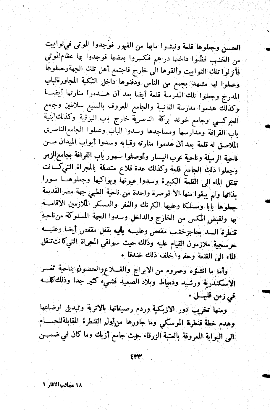الحسن وجعلوها قلعة ونبشوا ما بها من القبور فوجدوا الموتى في توابيت من الخشب فظنوا داخلها دراهم فكسروا بعضها فوجدوا بها عظام الموتى فأنزلوا تلك التوابيت وألقوها إلى خارج فاجتمع أهل تلك الجهة وحملوها وعملوا لها مشهدا بجمع من الناس ودفنوها داخل التكية المجاورة لباب المدرج وجعلوا تلك المدرسة قلعة أيضا بعد أن هدموا منارتها أيضا وكذلك هدموا مدرسة القانبية والجامع المعروف بالسبع سلاطين وجامع الجركسي وجامع خوند بركة الناصرية خارج باب البرقية وكذلك أبنية باب القرافة ومدارسها ومساجدها وسدوا الباب وعملوا الجامع الناصري الملاصق له قلعة بعد أن هدموا منارته وقبابه وسدوا أبواب الميدان من ناحية الرميلة وناحية عرب اليسار وأوصلوا سهور باب القرافة بجامع الزمر وجعلوا ذلك الجامع قلعة وكذلك عدة قلاع متصلة بالمجراة التي كانت تنقل الماء إلى القلعة الكبيرة وسدوا عيونها وبواكيها وجعلوها سورا بذاتها ولم يبقوا منها إلا قوصرة واحدة من ناحية الطبي جهة مصر القديمة جعلوها بابا ومسلكا وعليها الكرنك والغفر والعسكر الملازمين الإقامة بها ولقبض المكس من الخارج والداخل وسدوا الجهة المسلوكة من ناحية قنطرة السد بحاجز خشب مقفص وعليه باب يقفل مقفص أيضا وعليه حوسجية ملازمون القيام عليه وذلك حيث سواقي المجراة التي كانت تنقل الماء إلى القلعة وحفروا خلف ذلك خندقا.