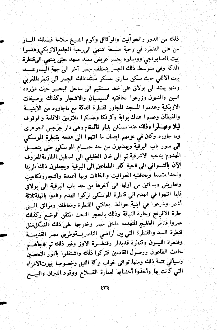 ذلك من الدور والحوانيت والوكائل وكوم الشيخ سلامة فيسلك المار من على القنطرة في رحبة متسعة تنتهي إلى رحبة الجامع الأزبكي وهدموا بيت الصابونجي ووصلوه بجسر عريض ممتد ممهد حتى ينتهي إلى قنطرة الدكة وفي متوسط ذلك الجسر ينعطف جسر آخر إلى جهة اليسار عند بيت الألفي حيث سكن سارى عسكر ممتد ذلك الجسر إلى قنطرة المغربي ومنها يمتد إلى بولاق على خط مستقيم إلى ساحل البحر حيث موردة التبن والشون ووزعوا بحافتيه السيسبان والاشجار وكذلك برصيفات الأزبكية وهدموا المسجد المجاور لقنطرة الدكة مع ما جاوره من الأبنية والغيطان وعملوا هناك بوابة وكرنكا وعسكرا ملامين الإقامة والوقوف ليلا ونهارا وذلك عند مسكن بليار قائمقام وهي دار جرجس الجوهري وما جاوره وكان في عزمهم ايصال ما انتهوا الىهدمه بقنطرة الموسكي إلى صور باب البرقية ويهدمون من حد حمام الموسكي حتى يتصل المهدوم بناحية الأشرفية ثم إلى خان الخليلي إلى اسطبل الطارمة العروفة الآن بالشنواني إلى ناحية كفر الطماعين إلى البرقية ويجعلون ذلك طريقا واحدا متسعا وبحافتيه الحوانيت والخانات وبها أعمدة وأشجار وتكاعيب وتعاريش وبساتين من أولها إلى آخرها من حد باب البرقية إلى بولاق فلما انتهوا في الهدم إلى قنطرة الموسكي تركوا الهدم ونادوا بالمهلة ثلاثة أشهر وشرعوا في أبنية حوائط بحافتي القنطرة ومعاطف ومزالق إلى حارة الافرنج وحارة النباقة وذلك بالحجر النحت المتقن الوضع وكذلك عمروا قناطر الخليج المتهدمة داخل مصر وخارجها على ذلك الشكل مثل قنطرة السد والقنطرة التي بين أراضي الناصرية وطريق مصر القديمة وقنطرة الليمون وقنطرة قدبدار وقنطرة الاوز وغير ذلك ثم فاجأهم حادث الطاعون ووصول القادمين فتركوا ذلك واشتغلوا بأمور التحصين وسيأتي تتمة ذلك ومنها توالي خراب بركة الفيل وخصوصا بيوت الأمراء التي كانت بها وأخذوا أخشابها لعمارة القلاع ووقود النيران والبيع