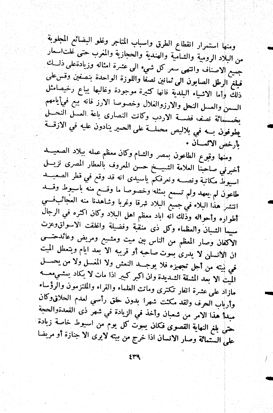 ومنها وقوع الطاعون بمصر والشام وكان معظم عمله ببلاد الصعيد أخبرني صاحبنا العلامة الشيخ حسن المعروف بالعطار المصري نزيل اسيوط مكاتبة ونصه ونعرفكم يا سيدي أنه قد وقع في قطر الصعيد طاعون لم يعهد ولم تسمع بمثله وخصوصا ما وقع منه باسيوط وقد انتشر هذا البلاء في جميع البلاد شرقاوغربا وشاهدنا منه العجائب في أطواره وأحواله وذلك أنه اباد معظم أهل البلاد وكان اكثره في الرجال سيما الشبان والعظماء وكل ذي منقبة وفضيلة وأغلقت الأسواق وعزت الأكفان وصار المعظم من الناس بين ميت ومشيع ومريض وعائد حتى أن الإنسان لا يدري بموت صاحبه أو قريبه إلا بعد أيام ويتعطل الميت في بيته من أجل تجهيزه فلا يوجد النعش ولا المغسل ولا من يحمل الميت إلا بعد المشقة الشديدة وأن أكبر كبير إذا مات لا يكاد يمشي معه مازاد على عشرة انفار تكترى وماتت العلماء والقراء والملتزمون والرؤساء وأرباب الحرف ولقد مكثت شهرا بدون حلق رأسي لعدم الحلاق وكان مبدأ هذا الأمر من شعبان وأخذ في الزيادة في شهر ذي القعدة والحجة حتى بلغ النهاية القصوى فكان يموت كل يوم من اسيوط خاصة زيادة على الستمائة وصار الإنسان إذا خرج من بيته لا يرى إلا جنازة أو مريضا