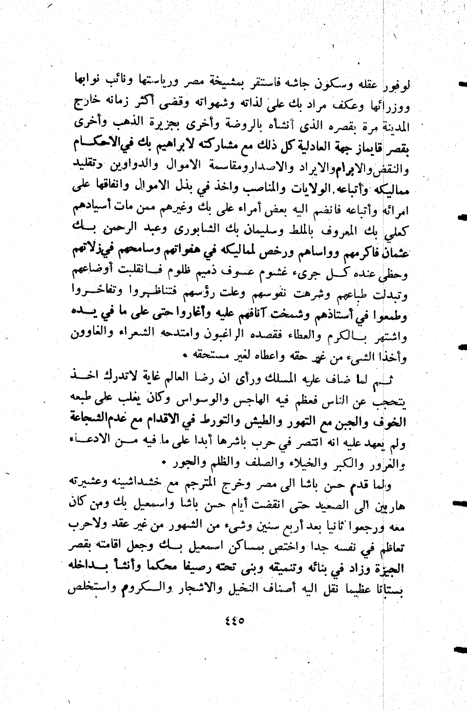 ولما قدم حسن باشا إلى مصر وخرج المترجم مع خشداشينه وعشيرته هاربين إلى الصعيد حتى انقضت أيام حسن باشا وأسمعيل بك ومن كان معه ورجعوا ثانيا بعد أربع سنين وشيء من الشهور من غير عقد ولا حرب تعاظم في نفسه جدا واختص بمساكن إسمعيل بك وجعل إقامته بقصر الجيزة وزاد في بنائه وتنميقه وبنى تحته رصيفا محكما وأنشأ بداخله بستانا عظيما نقل إليه أصناف النخيل والاشجار والكروم واستخلص