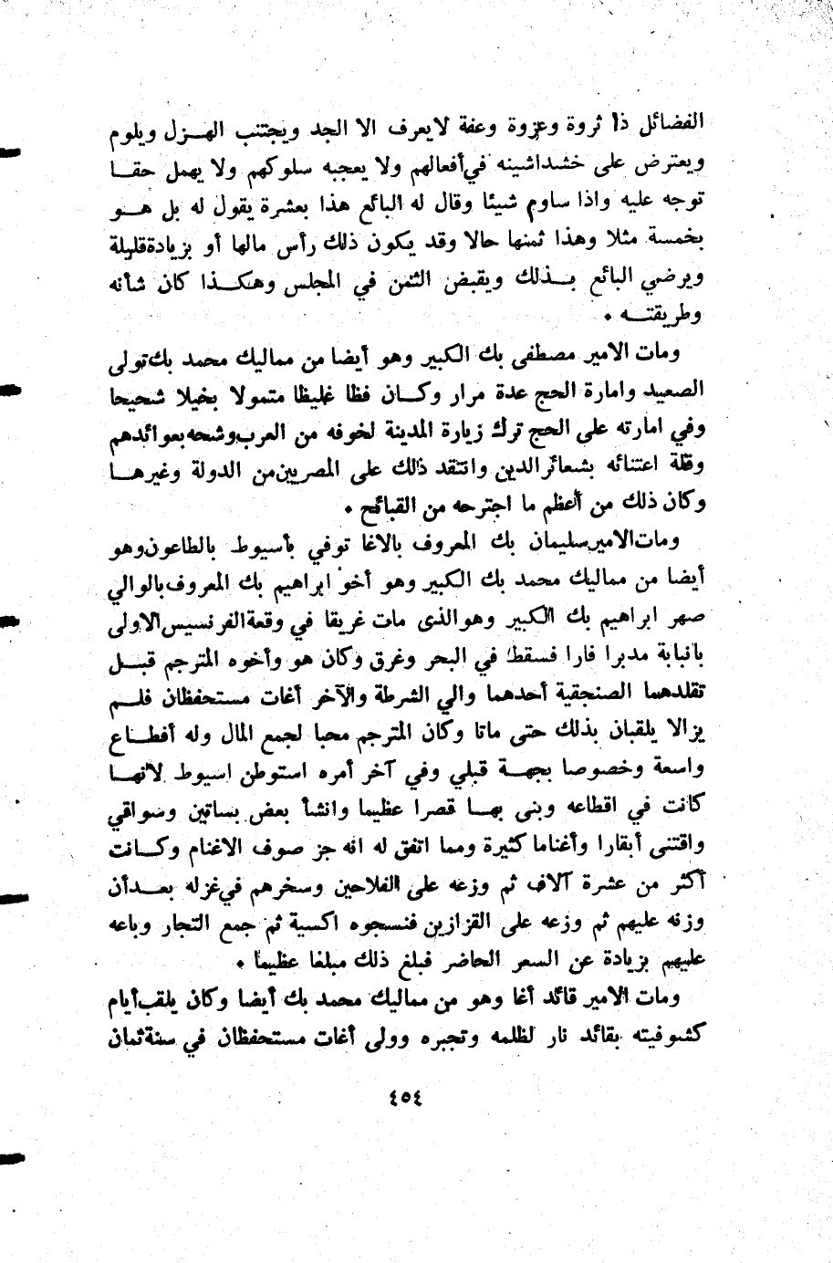 ومات الأمير سليمان بك المعروف بالاغا توفي بأسيوط بالطاعون وهو أيضا من مماليك محمد بك الكبير وهو أخو إبراهيم بك المعروف بالوالي صهر إبراهيم بك الكبير وهو الذي مات غريقا في وقعة الفرنسيس الأولى بانبابة مدبرا فارا فسقط في البحر وغرق وكان هو وأخوه المترجم قبل تقلدهما الصنجقية أحدهما والي الشرطة والآخر آغات مستحفظان فلم يزالا يلقبان بذلك حتى ماتا وكان المترجم محبا لجمع المال وله أفطاع واسعة وخصوصا بجهة قبلي وفي آخر أمره استوطن اسيوط لأنها كانت في اقطاعه وبنى بها قصرا عظيما وأنشأ بعض بساتين وسواقي واقتنى أبقارا وأغناما كثيرة ومما اتفق له أنه جز صوف الأغنام وكانت أكثر من عشرة آلاف ثم وزعه على الفلاحين وسخرهم في غزله بعد أن وزنه عليهم ثم وزعه على القزازين فنسجوه اكسيه ثم جمع التجار وباعه عليهم بزيادة عن السعر الحاضر فبلغ ذلك مبلغا عظيما.