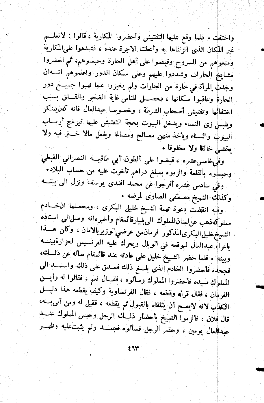 واختف فلما وقع عليها التفتيش وأحضروا المكارية قالوا: لا نعلم غير المكان الذي أنزلناها به وأعطتنا الاجرة عنده فشددوا على المكارية ومنعوهم من السروح وقبضوا على أهل الحارة وحبسوهم ثم أحضروا مشايخ الحارات وشددوا عليهم وعلى سكان الدور وأعلموهم أنه إن وجدت المرأة في حارة من الحارات ولم يخبروا عنها نهبوا جميع دور الحارة وعاقبوا سكانها فحصل للناس غاية الضجر والقلق بسبب اختفائها وتفتيش أصحاب الشرطة وخصوصا عبد العال فإنه كان يتنكر ويلبس زي النساء ويدخل البيوت بحجة التفتيش عليها فيزعج أرباب البيوت والنساء ويأخذ منهن مصالح ومصاغا ويفعل ما لا خير فيه ولا يخشى خالقا ولا مخلوقا.
