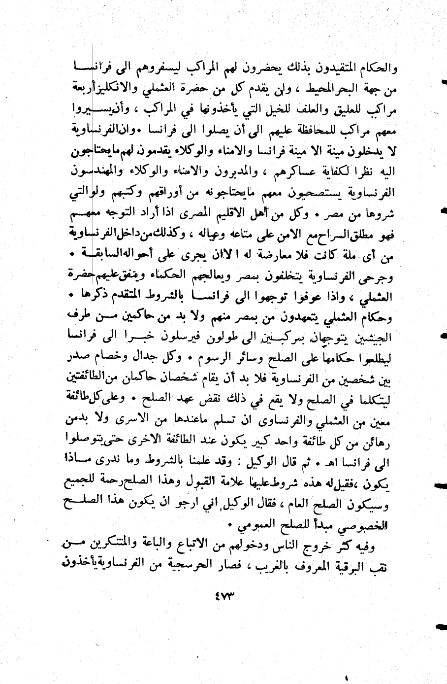 والحكام المتقيدون بذلك يحضرون لهم المراكب ليسفروهم إلى فرانسا من جهة البحر المحيط وأن يقدم كل من حضرة العثملي والانكليز أربعة مراكب للعليق والعلف للخيل التي يأخذونها في المراكب وأن يسيروا معهم مراكب للمحافظة عليهم إلى أن يصلوا إلى فرانسا وأن الفرنساوية لا يدخلون مينة إلا مينة فرانسا والأمناء والوكلاء يقدمون لهم ما يحتاجون إليه نظرا لكفاية عساكرهم والمدبرون والأمناء والوكلاء والمهندسون الفرنساوية يستصحبون معهم ما يحتاجونه من أوراقهم وكتبهم ولو التي شروها من مصر وكل من أهل الإقليم المصري إذا أراد التوجه معهم فهو مطلق السراح مع الأمن على متاعه وعياله وكذلك من داخل الفرنساوية من أي ملة كانت فلا معارضة له إلا أن يجري على أحواله السابقة وجرحى الفرنساوية يتخلفون بمصر ويعالجهم الحكماء وينفق عليهم حضرة العثملي وإذا عوفوا توجهوا إلى فرانسا بالشروط المتقدم ذكرها وحكام العثملي يتعهدون من بمصر منهم ولا بد من حاكمين من طرف الجيشين يتوجهان بمركبين إلى طولون فيرسلون خبرا إلى فرانسا ليطلعوا حكامها على الصلح وسائر الرسوم وكل جدال وخصام صدر بين شخصين من الفرنساوية فلا بد أن يقام شخصان حاكمان من الطائفتين ليتكلما في الصلح ولا يقع في ذلك نقض عهد الصلح وعلى كل طائفة معين من العثملي والفرنساوي أن تسلم ما عندها من الأسرى ولا بد من رهائن من كل طائفة واحد كبير يكون عند الطائفة الاخرى حتى يتوصلوا إلى فرانسا اه ثم قال الوكيل وقد علمنا بالشروط وما ندري ماذا يكون فقيل له هذه شروط عليها علامة القبول وهذا الصلح رحمة للجميع وسيكون الصلح العام فقال الوكيل: إني أرجو أن يكون هذا الصلح الخصوصي مبدأ للصلح العمومي.