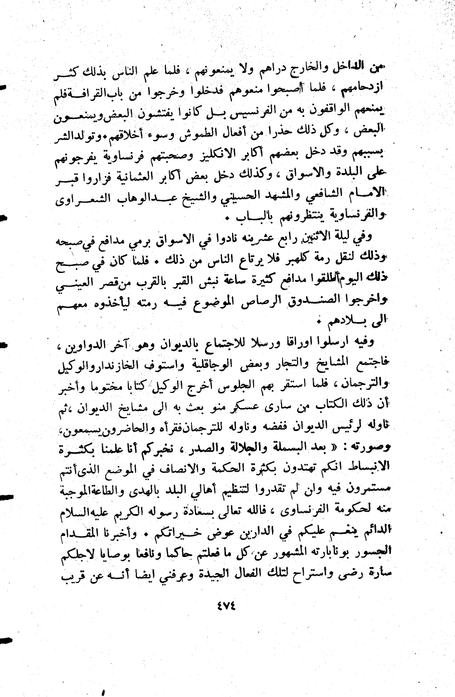 وفيه ارسلوا اوراقا ورسلا للاجتماع بالديوان وهو آخر الدواوين فاجتمع المشايخ والتجار وبعض الوجاقلية واستوف الخازندار والوكيل والترجمان فلما استقر بهم الجلوس أخرج الوكيل كتابا مختوما وأخبر أن ذلك الكتاب من سارى عسكر منو بعث به إلى مشايخ الديوان ثم ناوله لرئيس الديوان ففضه وناوله للترجمان فقرأه والحاضرون ويسمعون وصورته بعد البسملة والجلالة والصدر نخبركم أنا علمنا بكثرة الانبساط انكم تهتدون بكثرة الحكمة والانصاف في الموضع الذي أنتم مستمرون فيه وأن لم تقدروا لتنظيم أهالي البلد بالهدى والطاعة الموجبة منه لحكومة الفرنساوي فالله تعالى بسعادة رسوله الكريم عليه السلام الدائم ينعم عليكم في الدارين عوض خيراتكم وأخبرنا المقدام الجسور بونابارته المشهور عن كل ما فعلتم حاكما ونافعا بوصايا لأجلكم سارة رضي واستراح لتلك الفعال الجيدة وعرفني أيضا أنه عن قريب